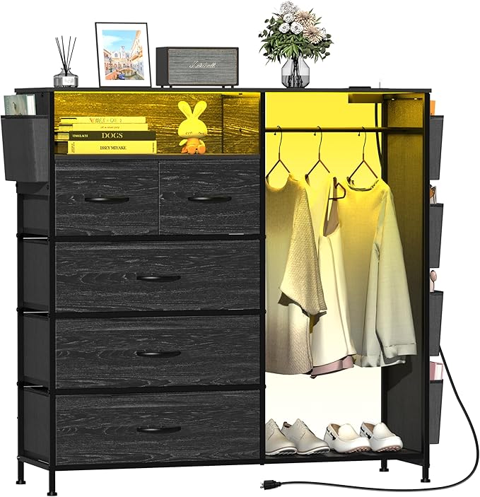• 2-in-1 Dresser with Clothes Rack: This dresser features a unique hanging design, the closet combo with a handy clothes rack for daily wear. The hanging space can also be used to place umbrellas or potted plants. 5 deep drawers offer ample storage, accommodating socks, coats, or jeans, eliminating the need for separate furniture