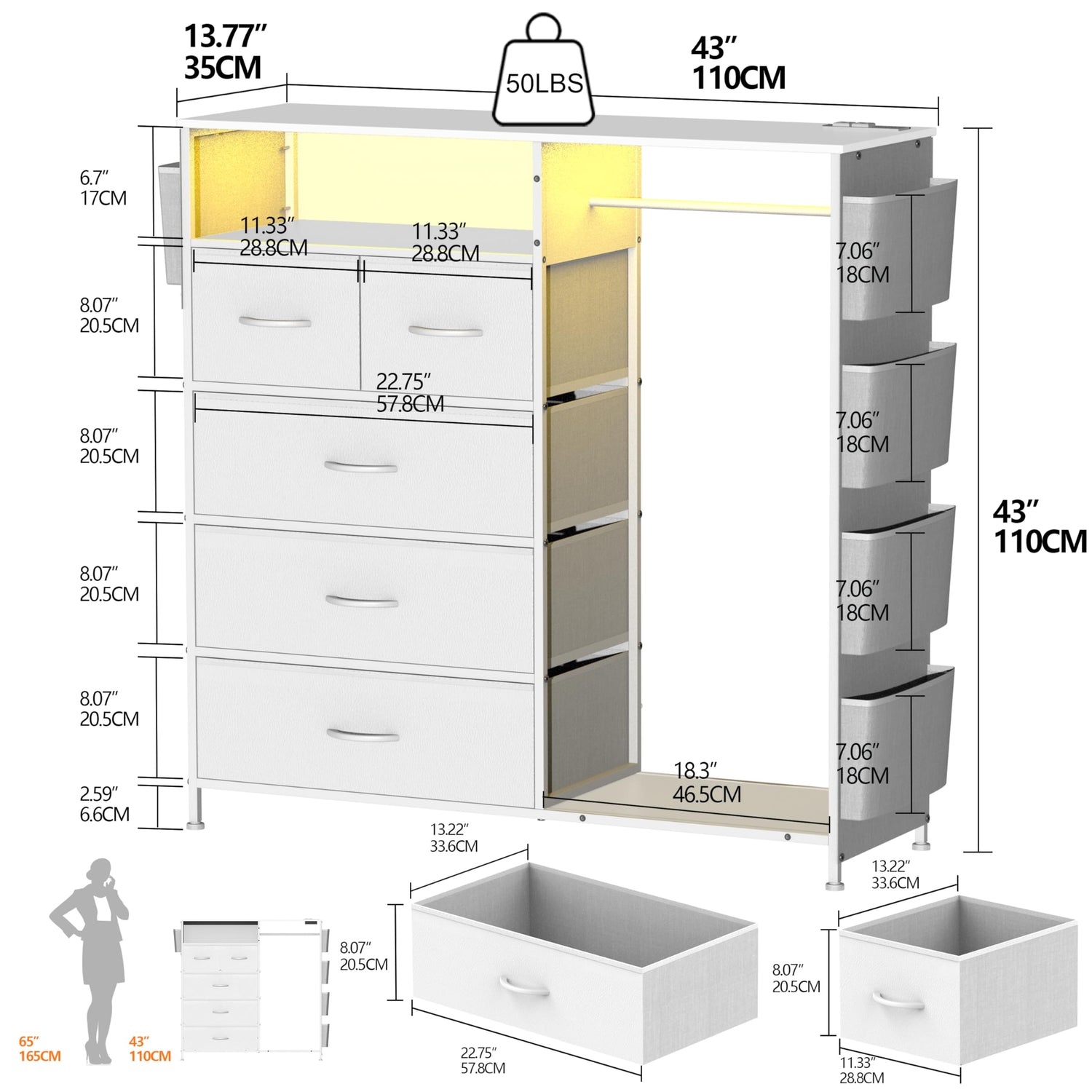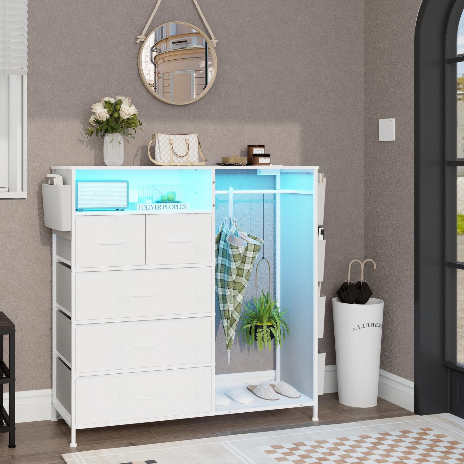 • The white dresser with a built-in RGB LED light strip, offering adjustable colors and brightness, 20 colors change,21 Dynanic modes,8 Speed modes, 8 Brightness modes. Multiple lighting modes suitable for different atmospheres
