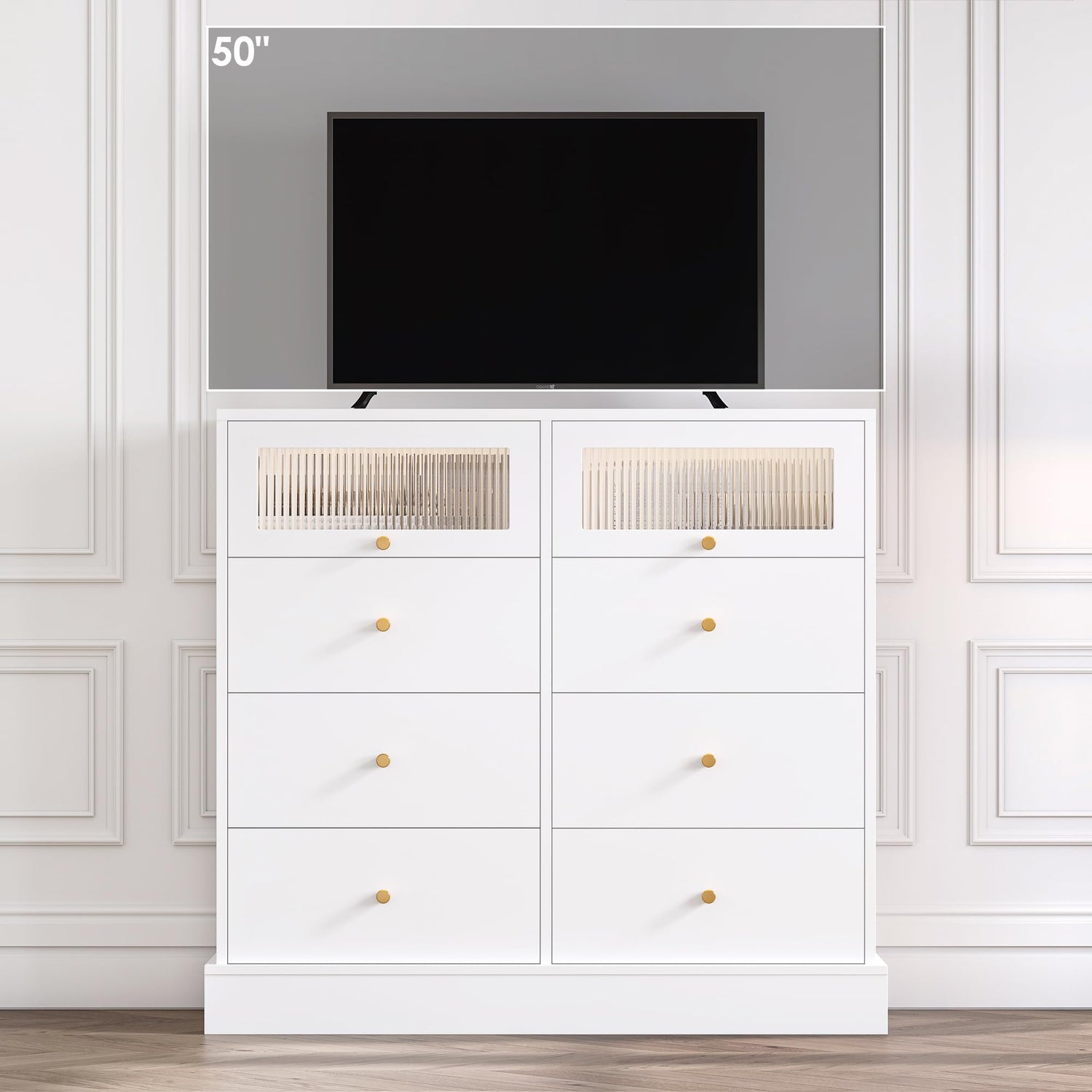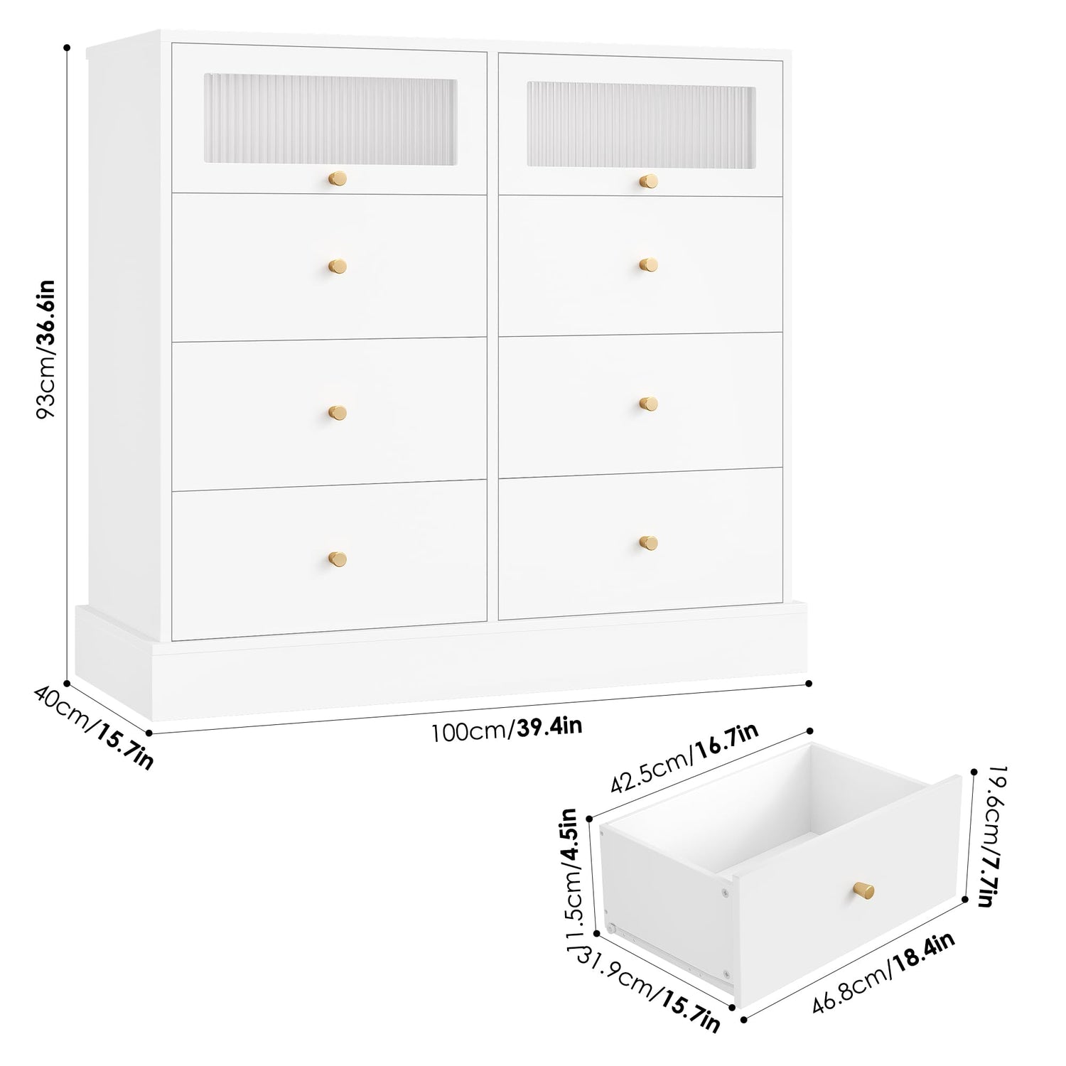 White Dresser, 8 Drawer Dresser with 2 Glass Doors, White and Gold Dresser Chest