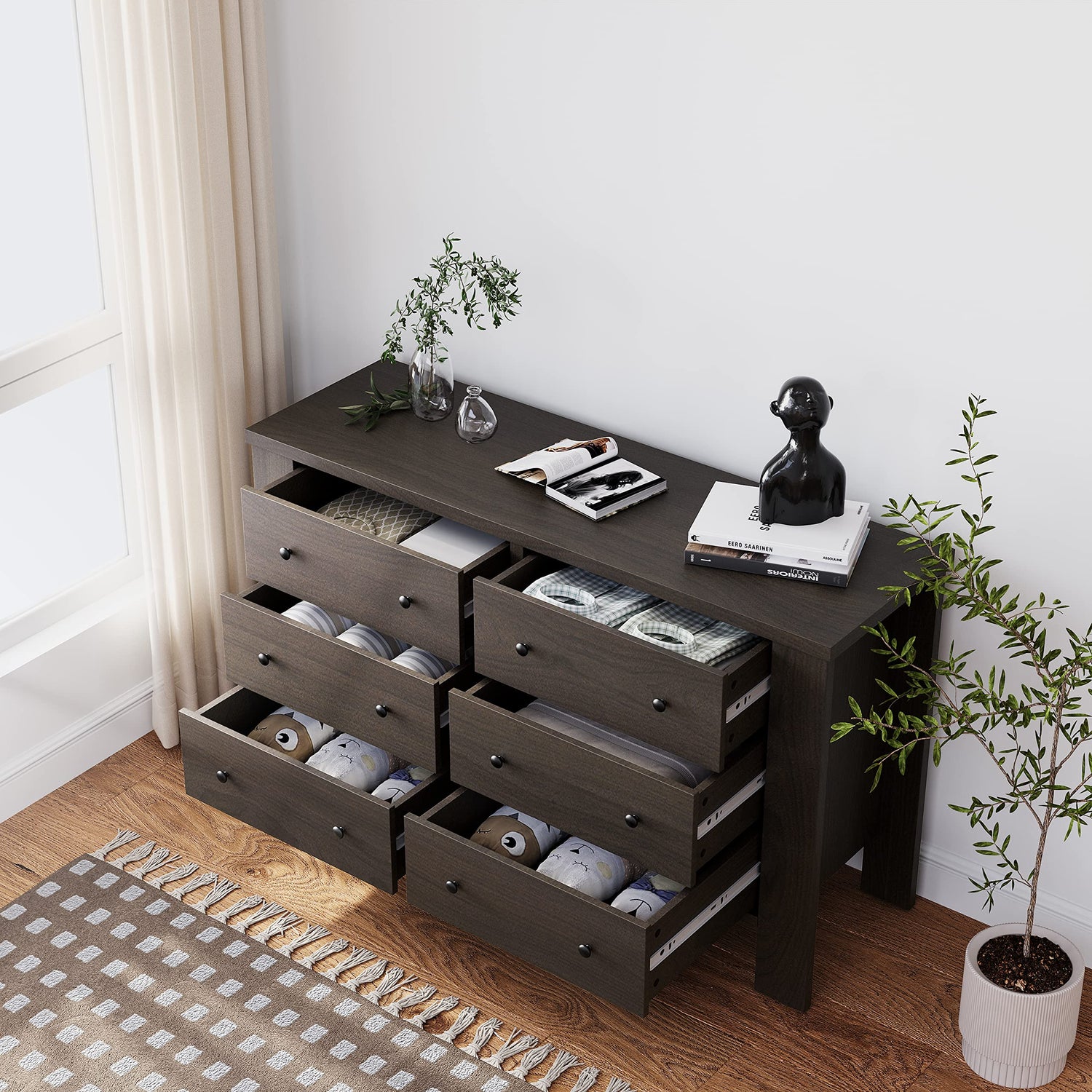 - MODERN ELEGANCE: This 6-drawer bedroom dresser seamlessly blends sleek contemporary design with practical storage solutions, enhancing various interior décors and adding a touch of sophistication to any space.