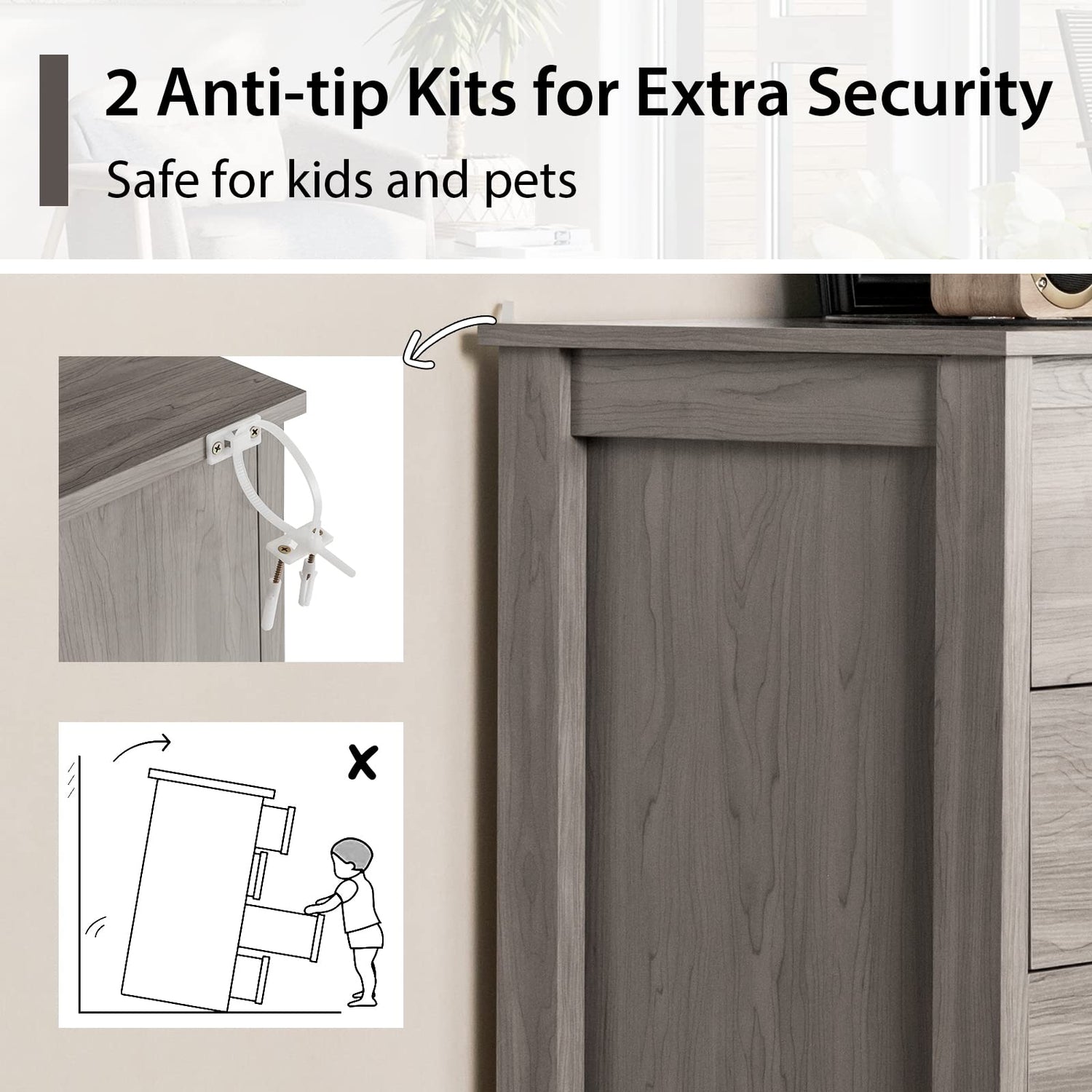 - The vertical chest of drawers stands 41.5” tall. To ensure stability for home use, it is fitted with 2 anti-tip kits to prevent wobbling or tipping over. Thus, the storage cabinet is safe for kids and pets.