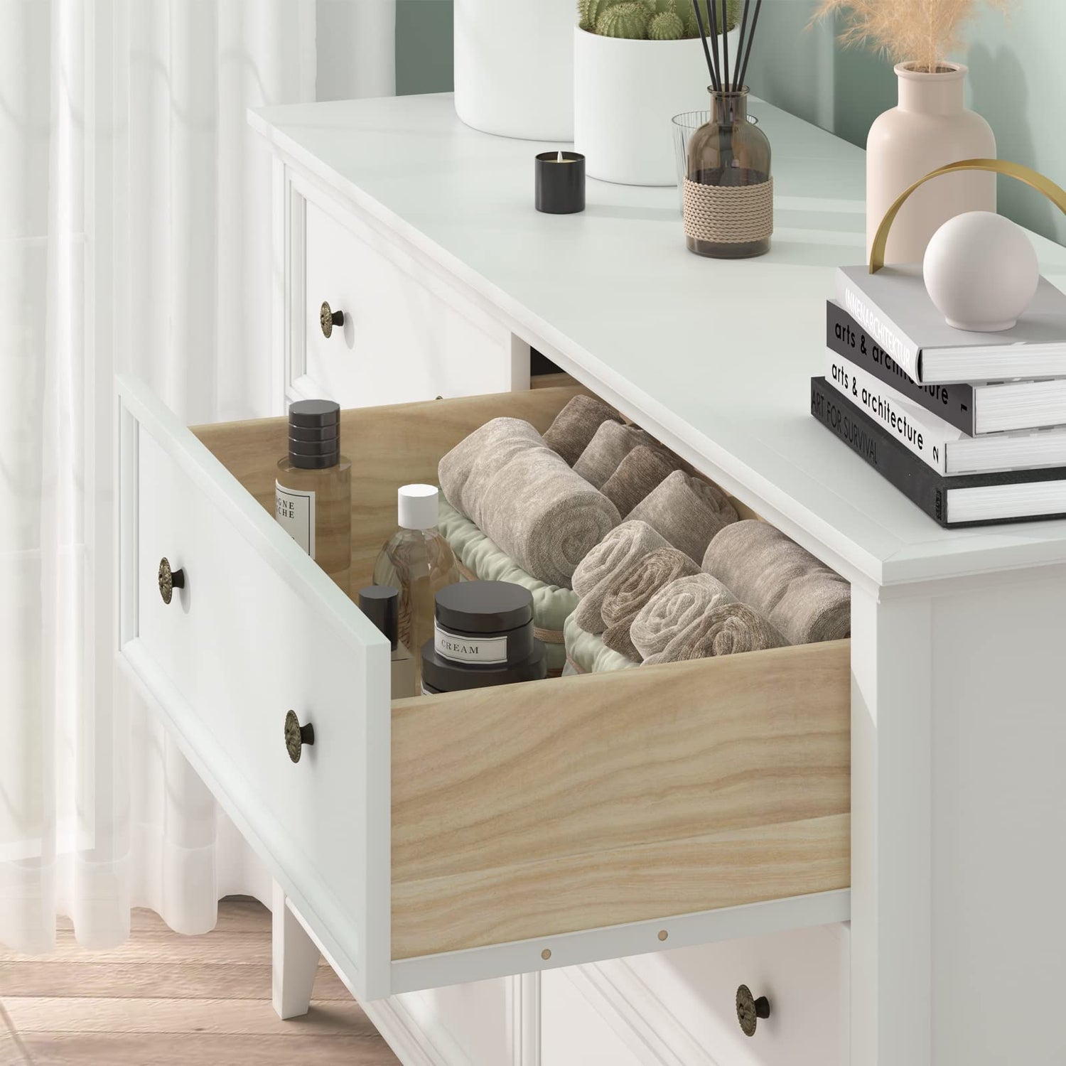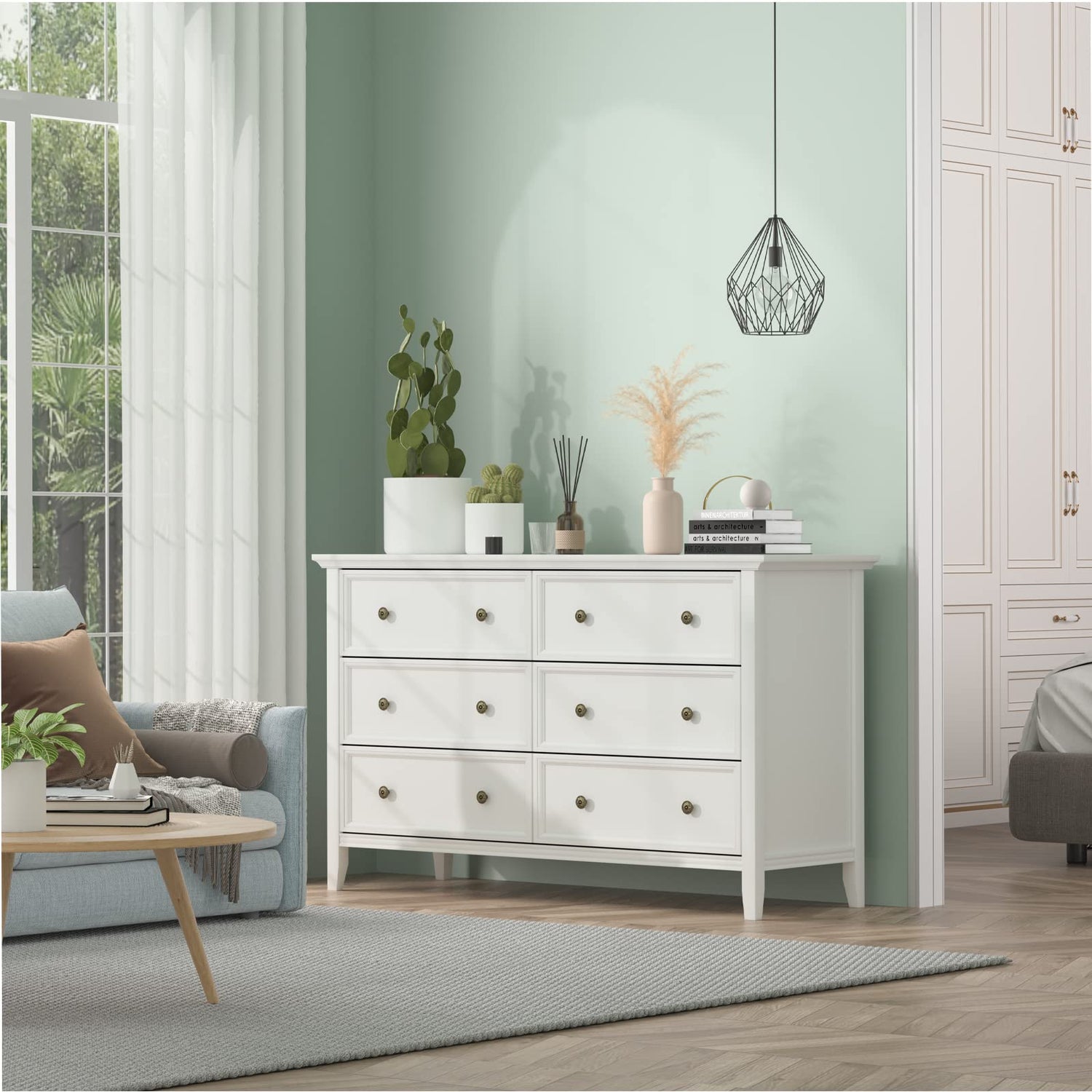 - With elegant frame-paneling design, sleek white finish, brass nickel handle and tapered solid wood legs, IKENO white 6 Double Drawers Dresser easily adapts to your home style, making your room more fashionable and brighter.
