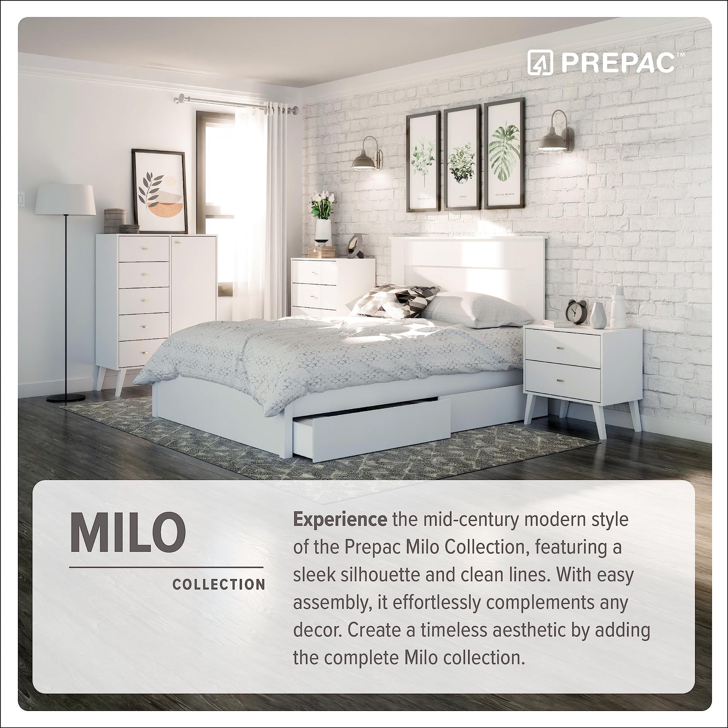 - Features 7 drawers as storage space with four 8" long tapered solid wooden legs, brass finished knobs, and a black laminate finish that accentuates a clean mid-century style