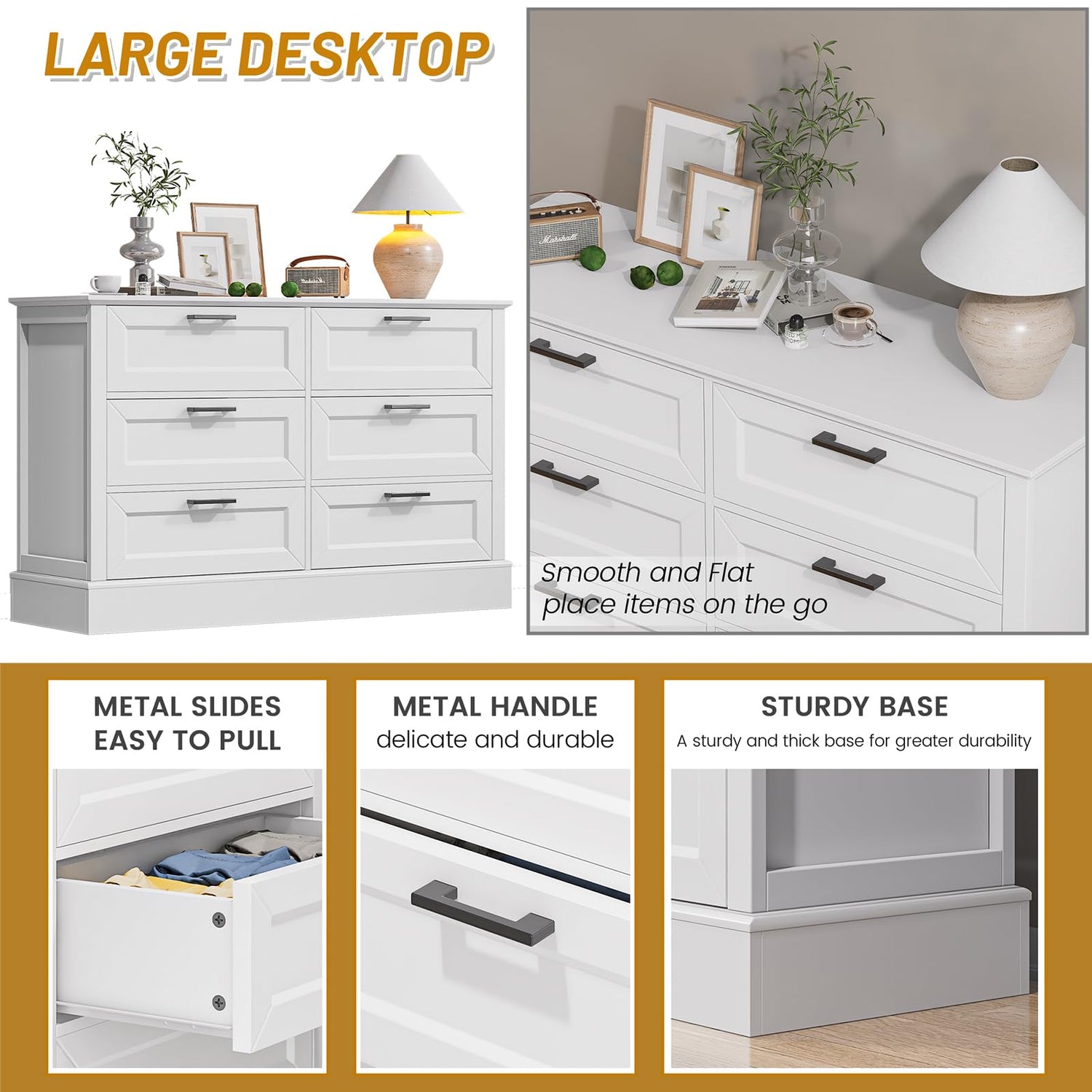 • Spacious Storage: 47.2”W x 15.7”D x 30”H. The wooden white dresser features 6 deep drawers (20.9”W x 12.4”D x 5”H) for ample storage space. Perfect for clothes, stocking, blankets, toys and more.