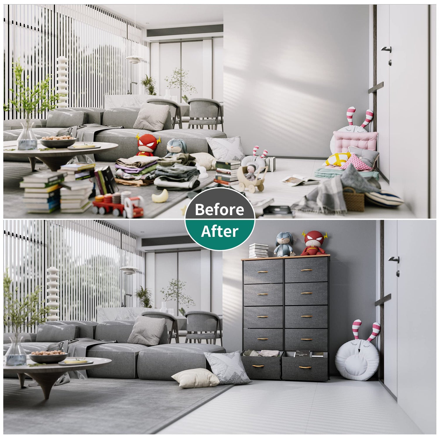 - 10 DRAWER DRESSER- The chest of drawers features 10 foldable deep drawers and easy-to-pull plastic handles; High quality non-woven synthetic fabric is easy to care