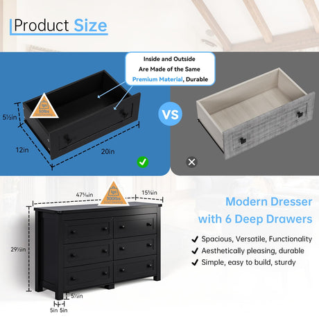 Black Dresser Bedroom Furniture, Wood Dressers for Bedroom with 6 Drawers Dressers