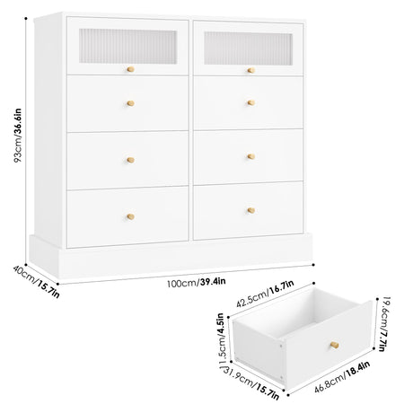 White Dresser, 8 Drawer Dresser with 2 Glass Doors, White and Gold Dresser Chest
