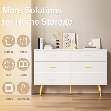 White 6 Drawer Dresser for Bedroom, Wooden White Double Dresser with Gold Handles
