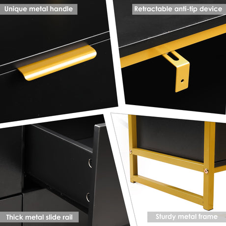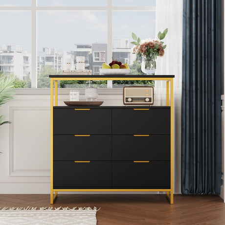 Black 6 Drawer Dresser for Bedroom, Wooden Black Double Dresser with Gold Handles