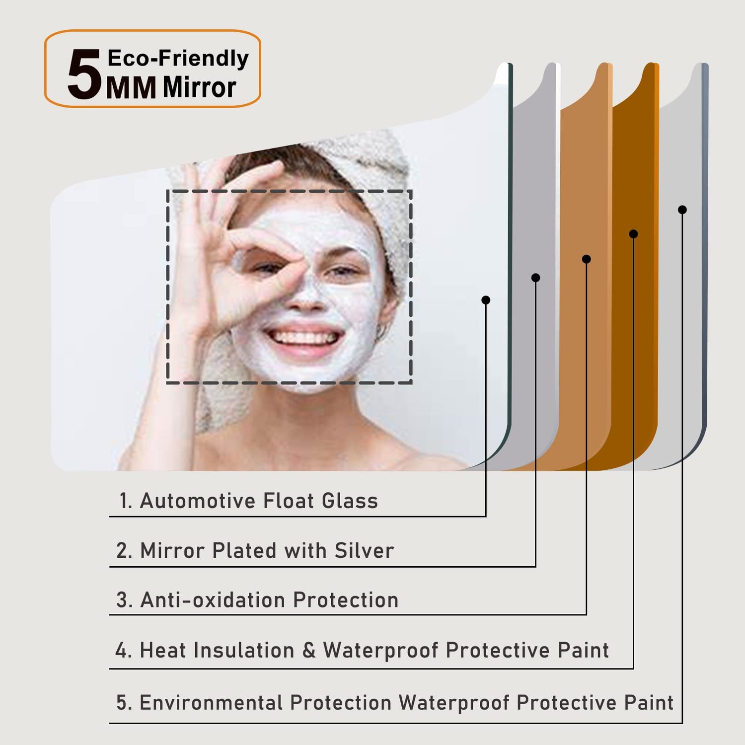 - 5mm Mirror: The vanity bathroom mirror is made of 5mm copper-free, anti-rusting materials with polished edges. The CRI is over 92 which will give you 35% more clarity than a conventional mirror. This allows you to see the most natural reflection of yourself.