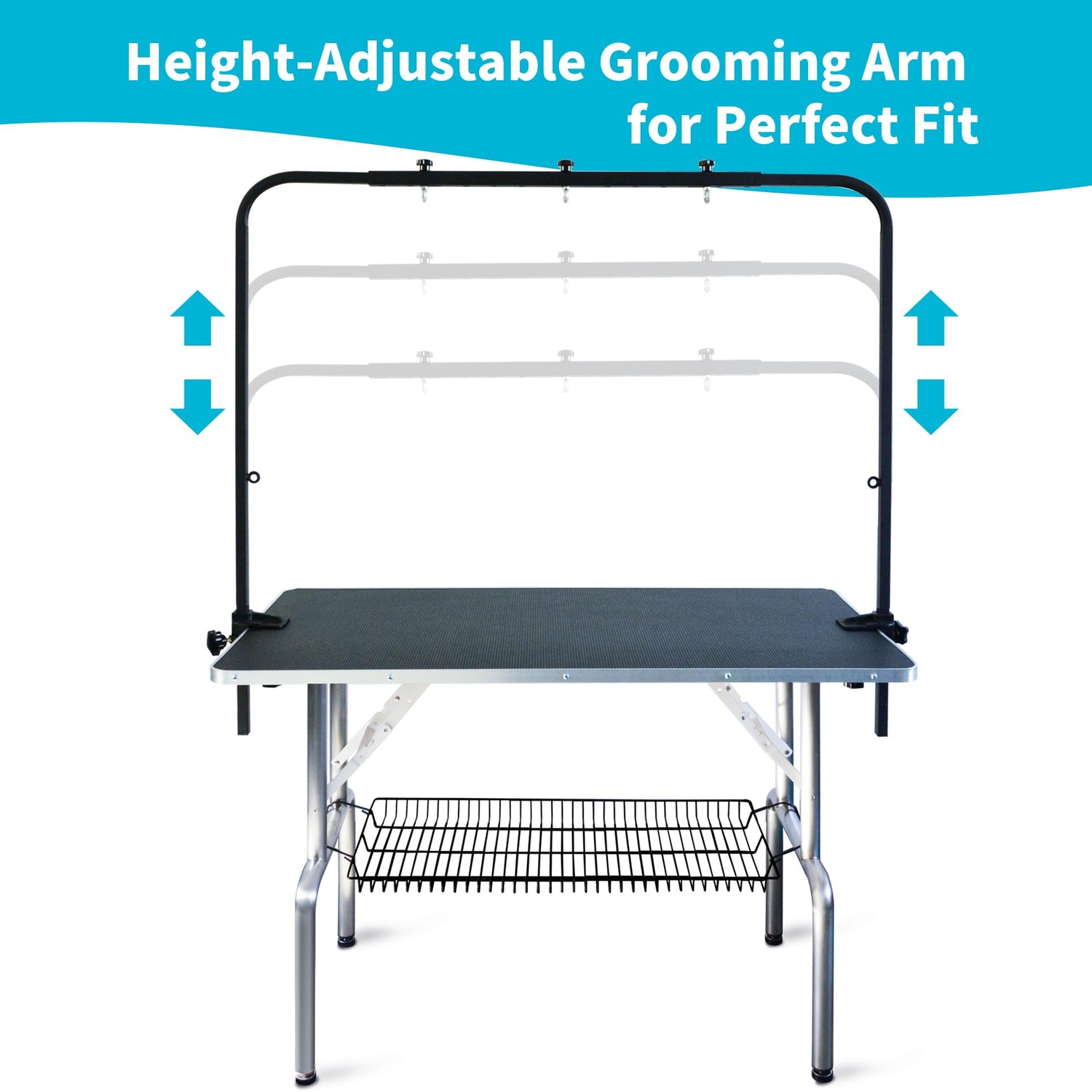 This heavy-duty grooming table includes everything needed for professional pet care: a 43-inch height-adjustable grooming arm, secure restraint system, sturdy clamp, and convenient removable storage basket. The premium rubber mat surface provides waterproof, anti-slip protection while ensuring your pet's comfort and safety during grooming, trimming, dressing, and drying.