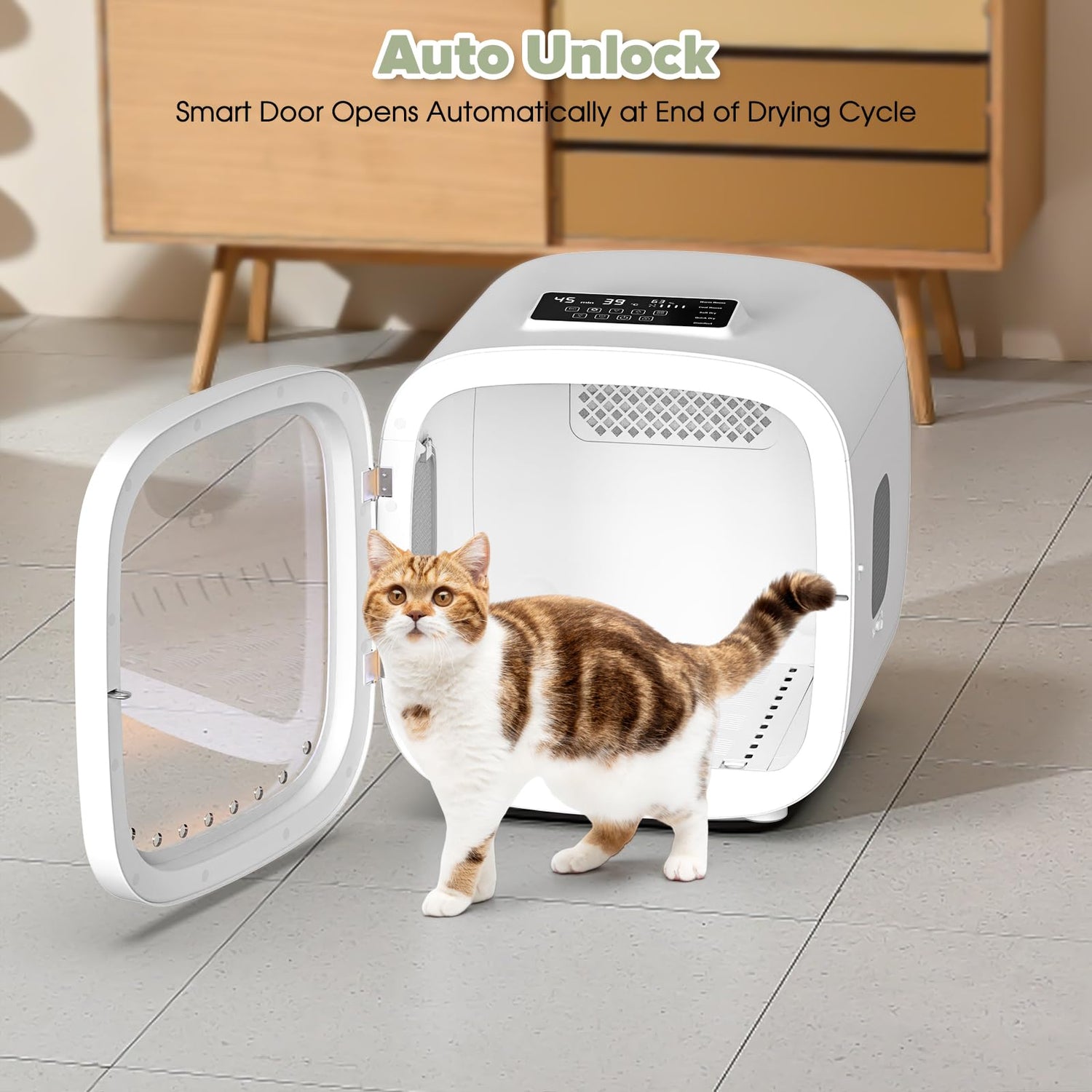 - Automatic Door Opening: Safely releases your pet at the end of each cycle