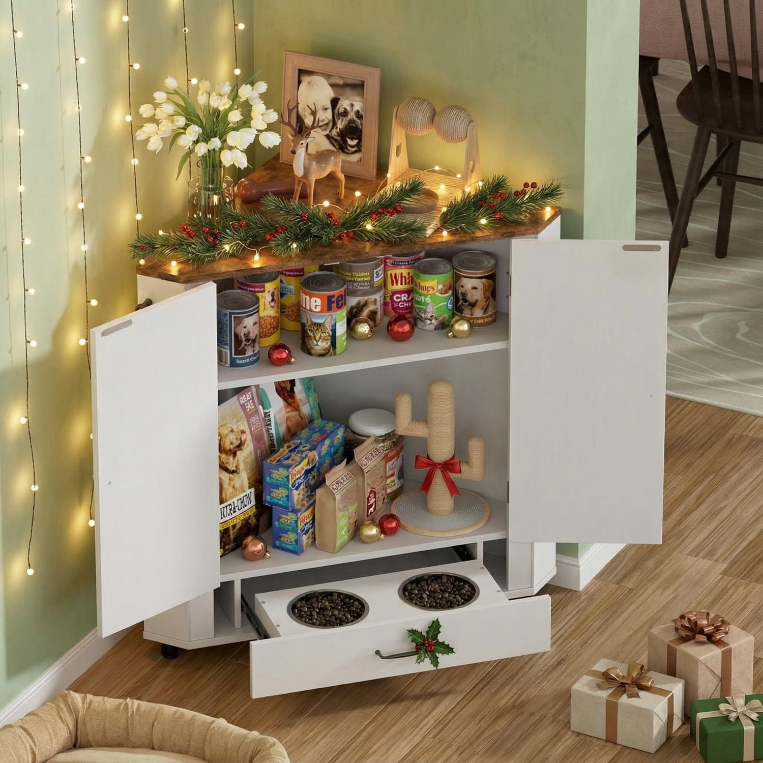 Transform your pet care space with this elegant 2-in-1 corner cabinet that combines food storage and an elevated feeding station. The classic white farmhouse design seamlessly integrates with any décor while maximizing space efficiency in your kitchen, entryway, or apartment.