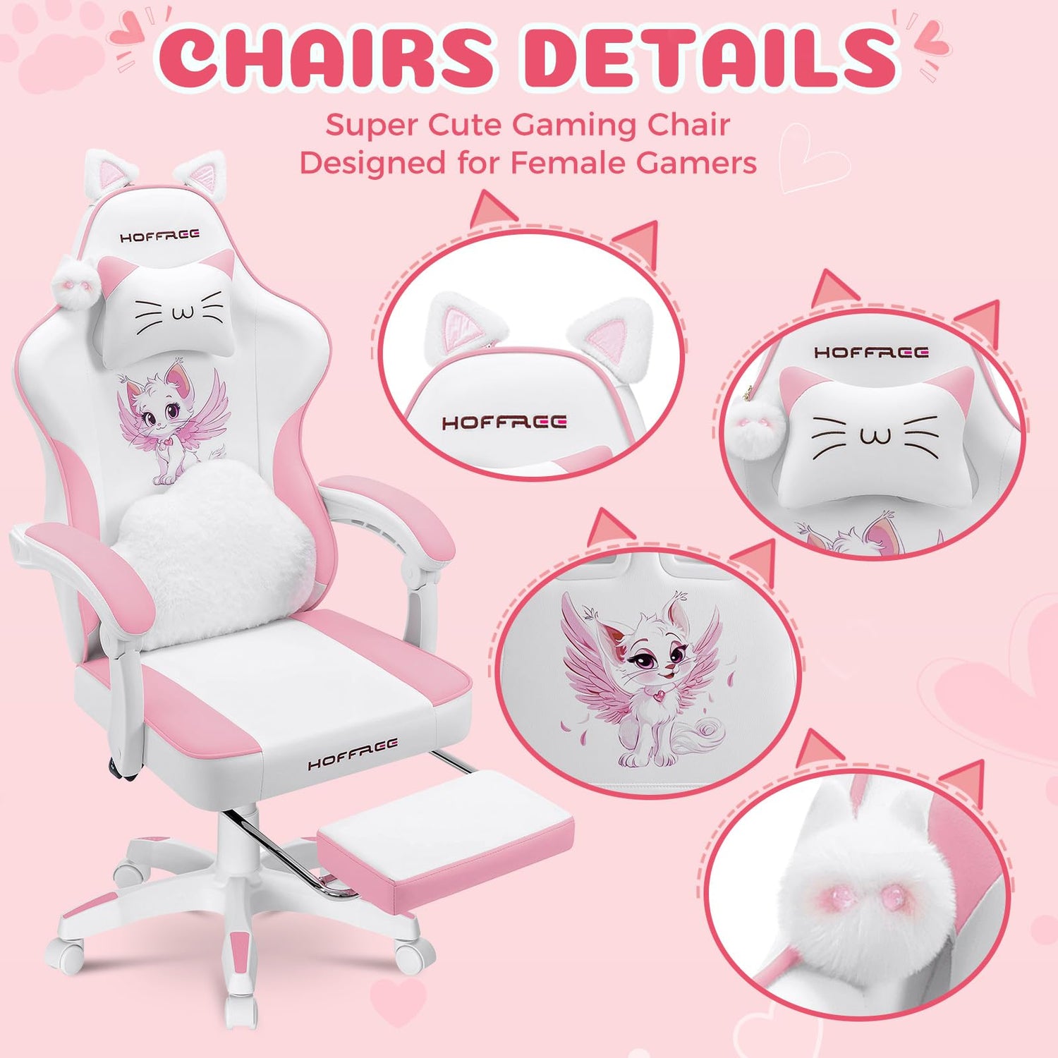 Pink Gaming Chair with Cat Ears and Footrest - Pink+white is backordered and will ship as soon as it is back in stock.