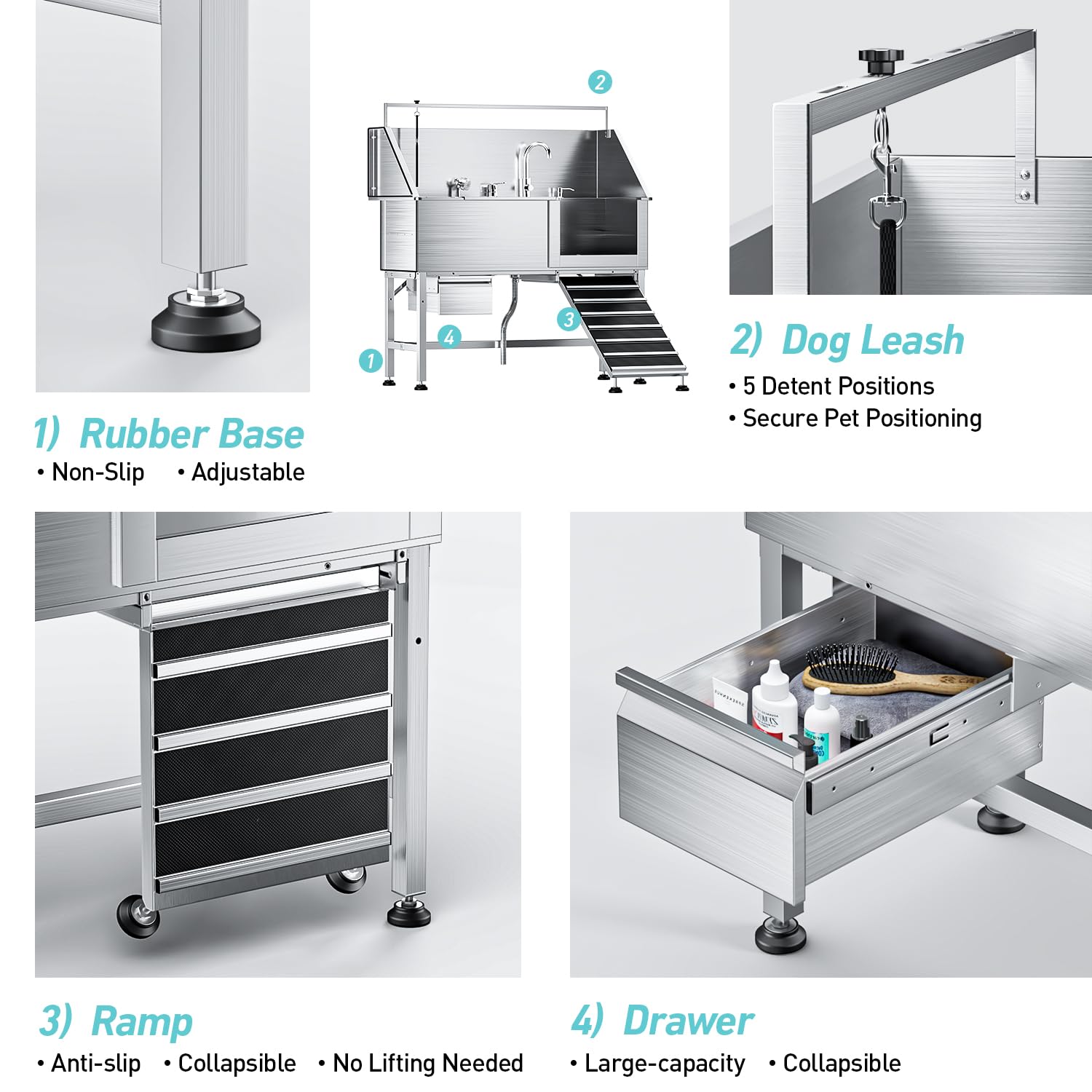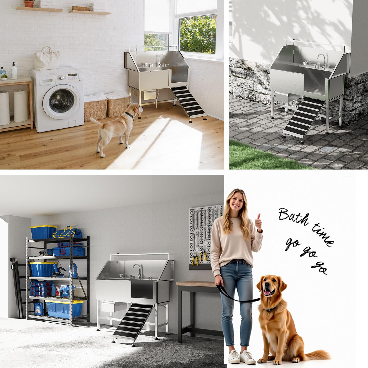 Professional 56" Dog Washing Station - Stainless Steel Grooming Tub with Ramp