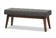 - Channel classic good looks in your aesthetic with the handsome walnut wood and fabric of the Elia button-tufted bench. Constructed of solid rubberwood frame, this padded bench is upholstered in dark grey polyester fabric for a resilient surface with luxurious comfort and lasting good looks. Design is ideal for your living area or entrance as well as waiting rooms and offices