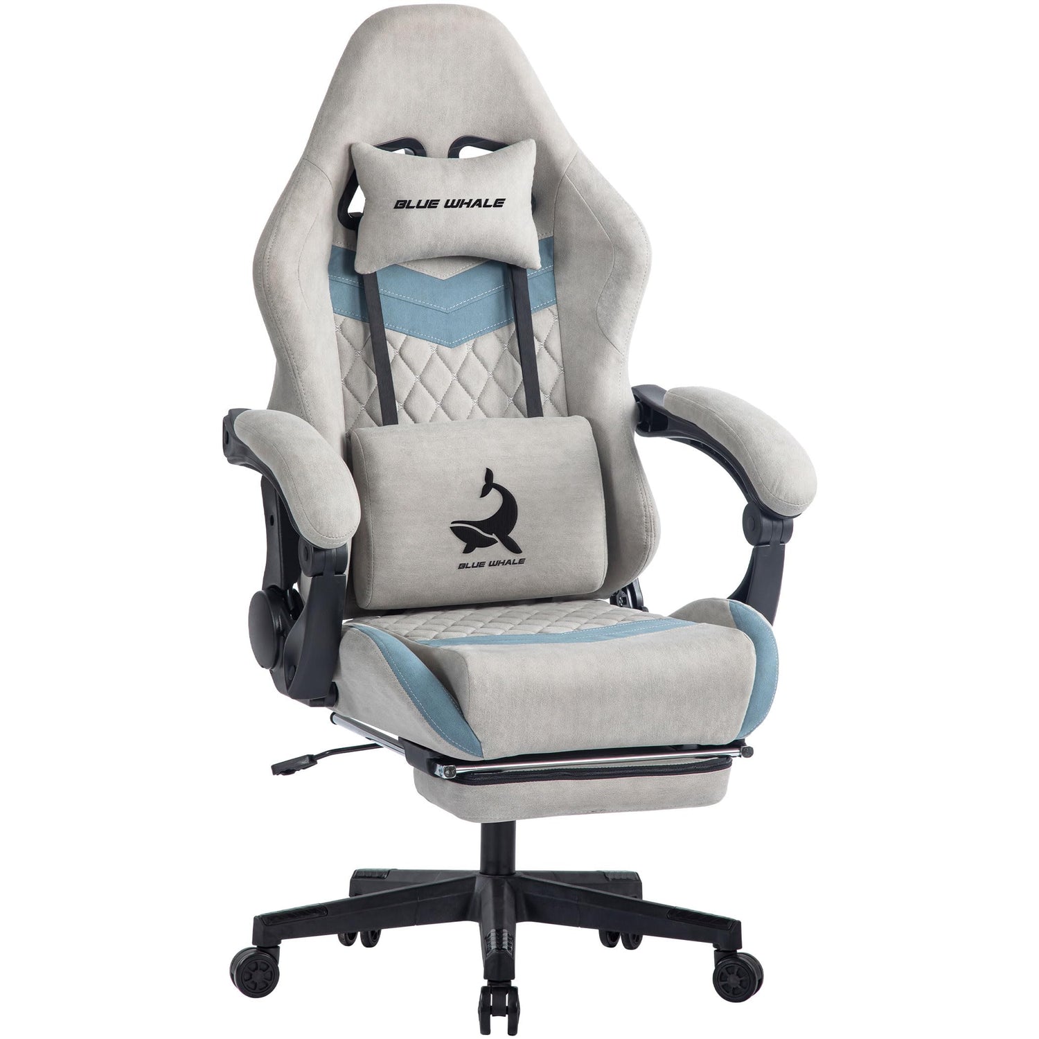 - Blue Whale gaming chair employs individual headrests and write-up adjustable lumbar support cushions its interior is padded with memory foam. Ensure this game chair gives the user a different back and head support experience. Unique hand-stitched embroidery of the Grey Gaming Chair on the headrest and lumbar cushion. Makes this video gaming chair stand out like no other