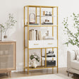 - Modern Style Shelving Unit: The wood bookcase features white panels, golden metal handles, and modern-style iron mesh on the top and bottom, adding a sleek touch to the modern style. With its simplicity and chic design, the bookshelf with storage seamlessly fits into various room styles, making it a great addition to both offices and homes