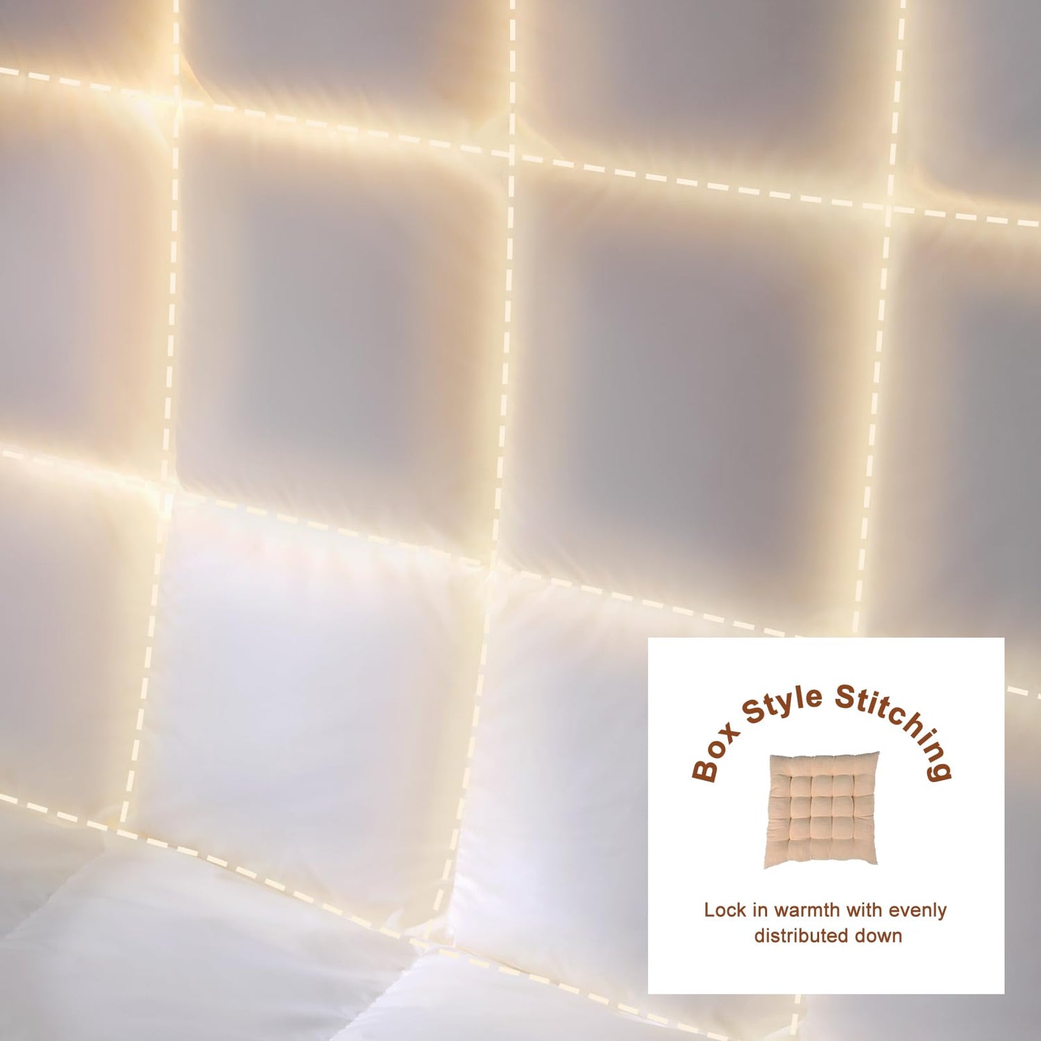 - Unique box-style stitching ensures even distribution of the down, effectively preventing cold spots and providing a uniform and comfortable temperature. This bed comforter is equipped with 8 corner loops for securing the duvet cover, effectively preventing the duvet from shifting during sleep, ensuring your sleep experience is not disrupted.