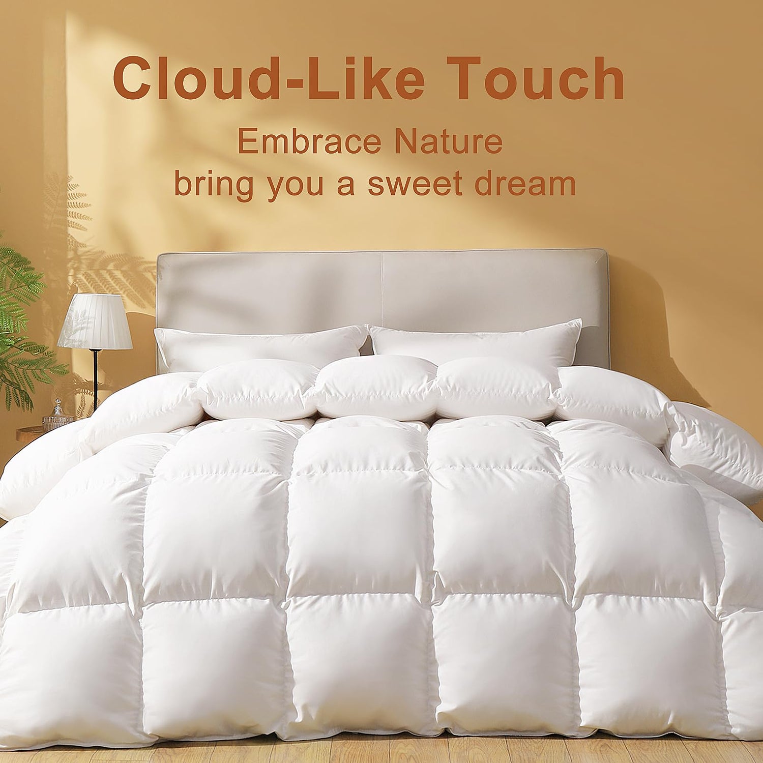 DOWNSTORIA Feather Down Comforter Oversized King Size, Ultra Soft 100% Cotton Duvet Insert, Luxurious Hotel Collection White Fluffy Bedding Comforters, All Season Medium Warmth 120 x 98 Inch.