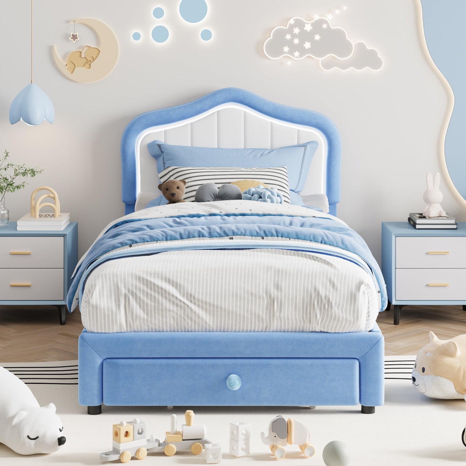 GAOMON Upholstered Twin-XL Size Bed Frame with Smart Led Headboard, Velvet Platform Bed Frame with Storage Drawer for Kids, Wooden Slats Support, No Box Spring Needed, Easy Assembly, Blue