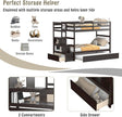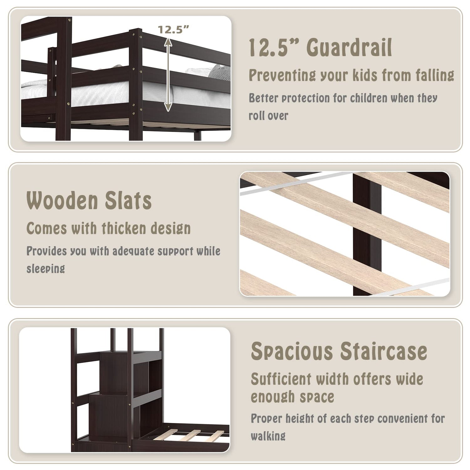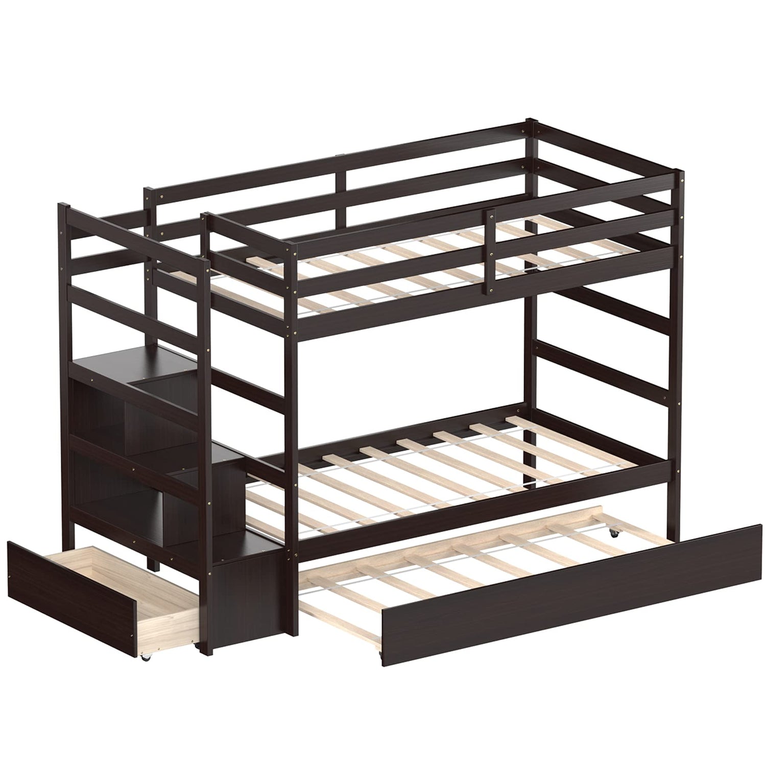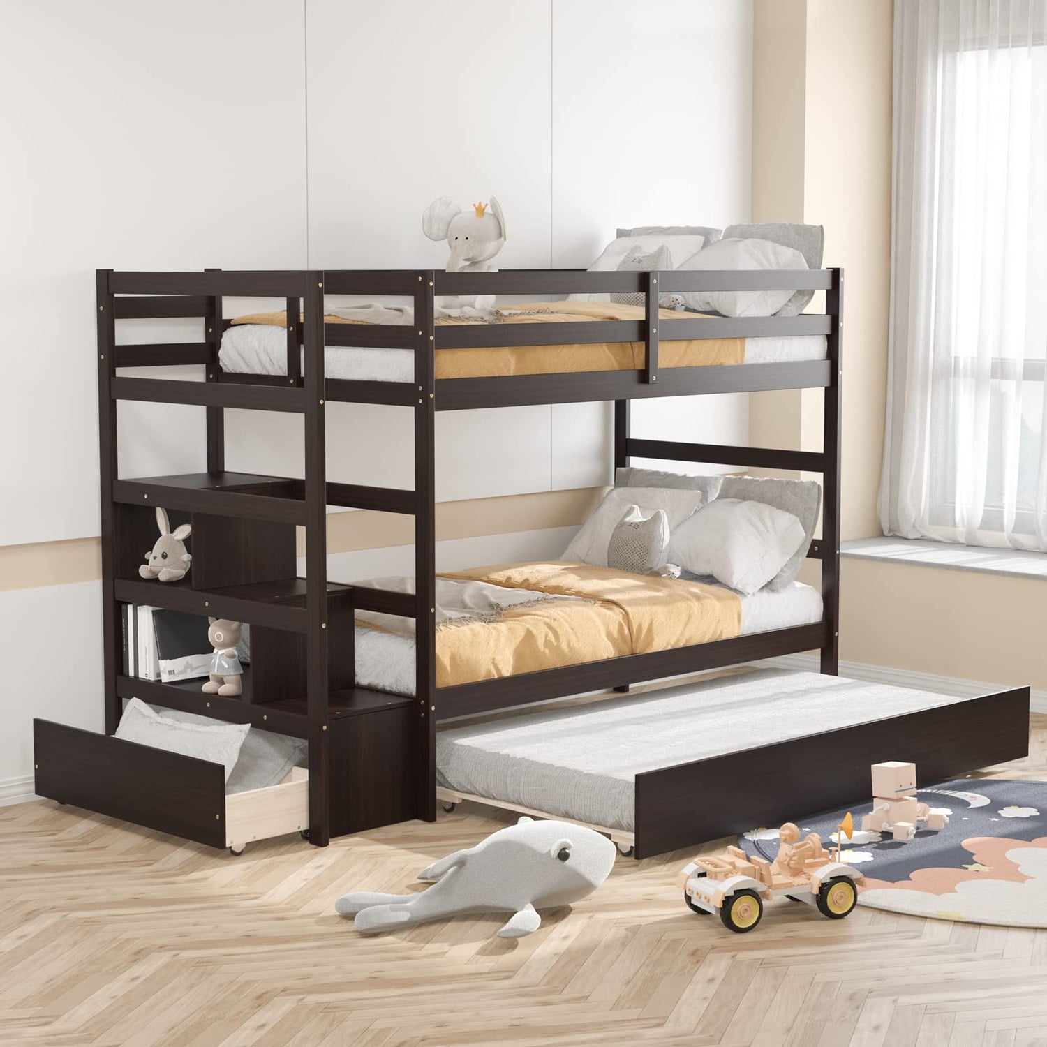 KOMFOTT Twin Over Twin Bunk Bed with Trundle & Storage Stairs, Wooden Bunk Bed Frame with Storage Shelves & Drawer, Trundle Bunk Bed Frame with Guardrails, No Spring Box Required (Espresso)
