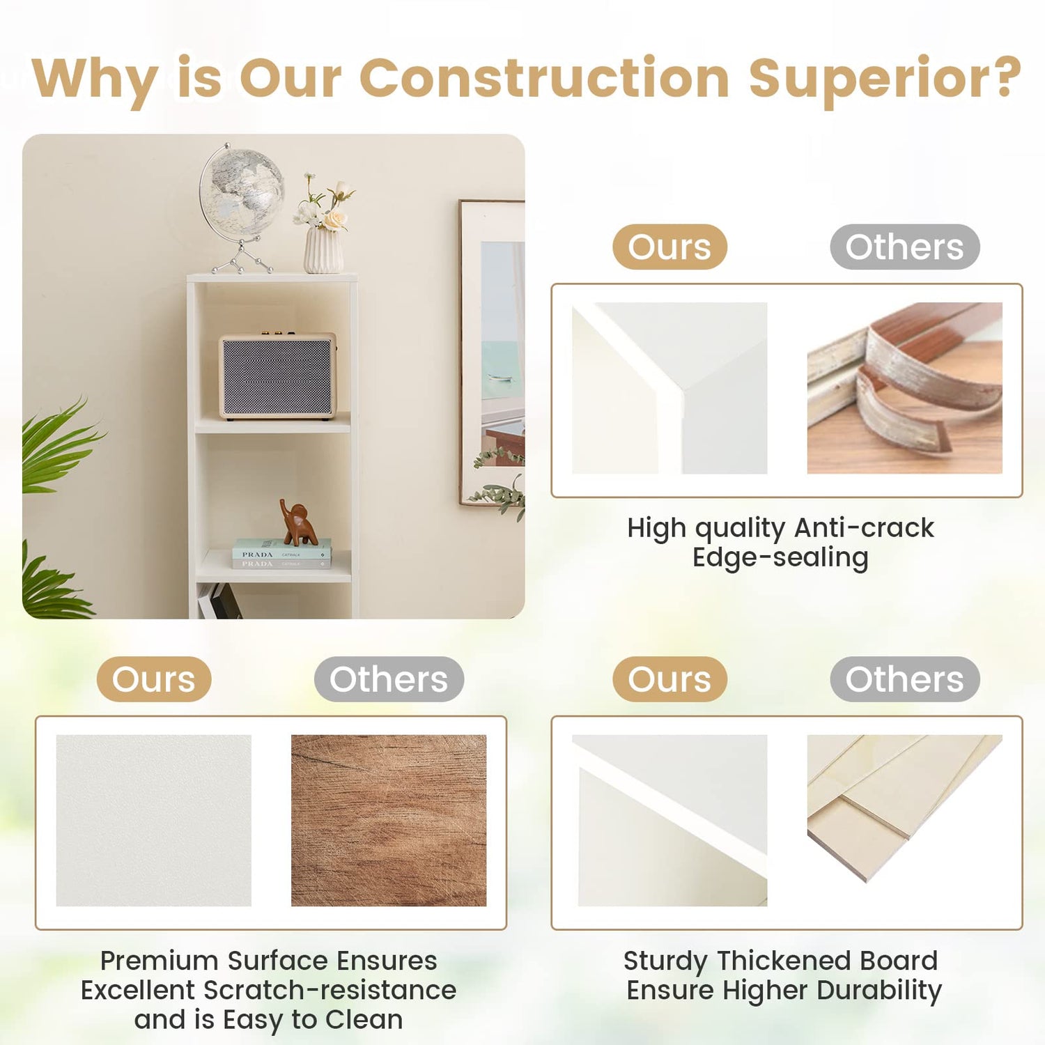 - [Premium Materials for Durability]: Made of high-quality thickened board, the white bookcase is anti-crack, anti-warp and built to last. The 5 tiers of shelves can support 165 lbs in total. Meanwhile, the smooth and burr-free surface is waterproof for easy cleaning and maintenance.