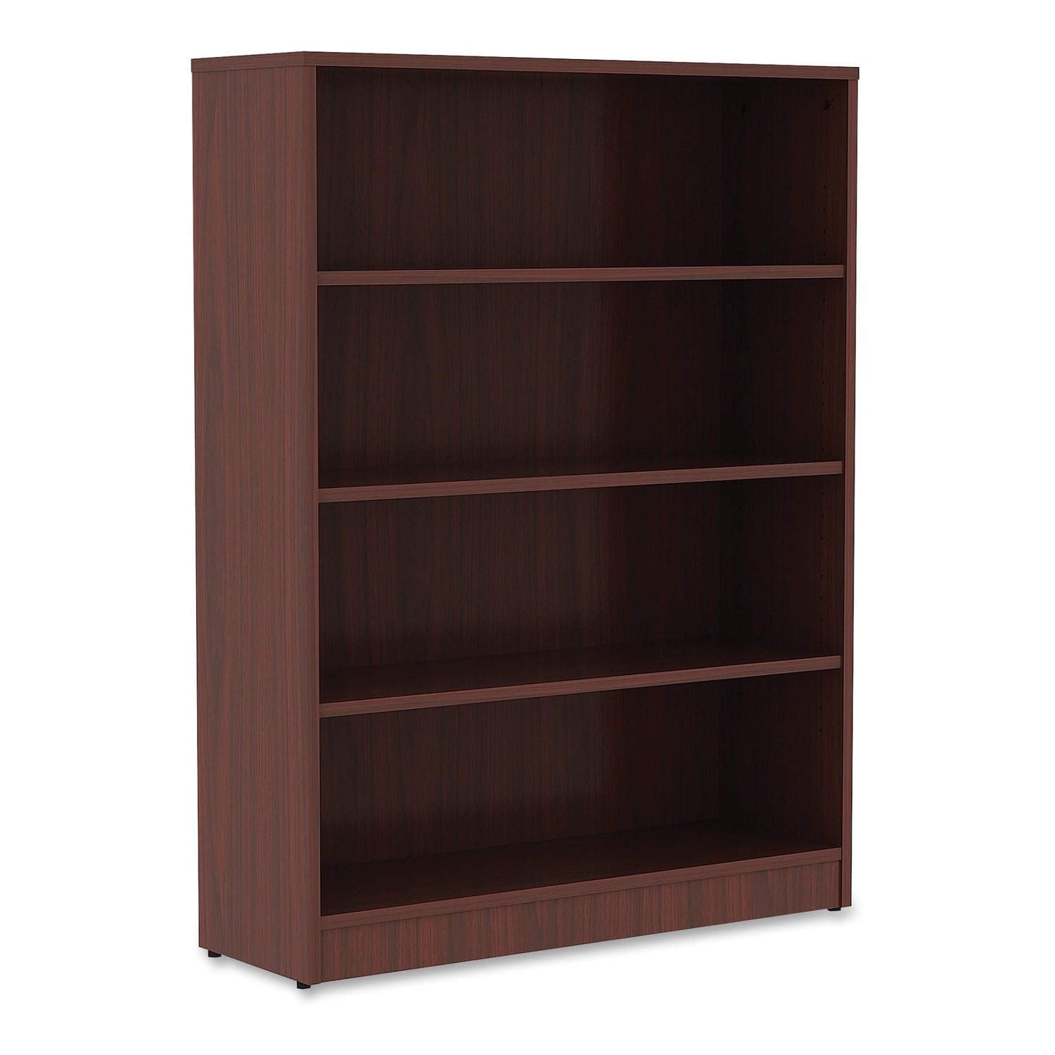 Details: Sturdy, four-shelf bookcase offers high-quality laminate construction and a contemporary design. Shelves are 3/4" thick and made of 18mm thick, medium-density fiberboard with thermally fused, Mahogany laminate for long-lasting use. The visible, one-piece backing behind the shelves is made with 3mm thick, medium-density fiberboard and matching laminate. Both sides are finished. Bookcase features three adjustable shelves, one fixed bottom shelf, square edges and adjustable feet. Each shelf holds up to 75 lb.