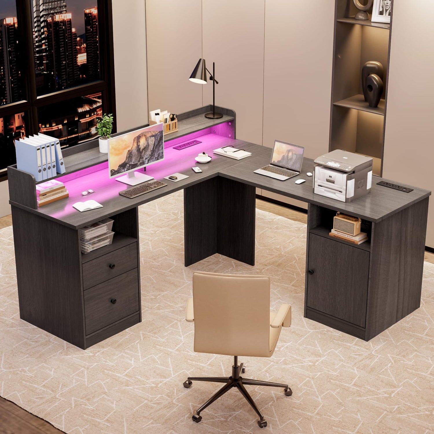 Shaped Desk with LED Lights & Power Outlets, 60" Corner Computer Desk