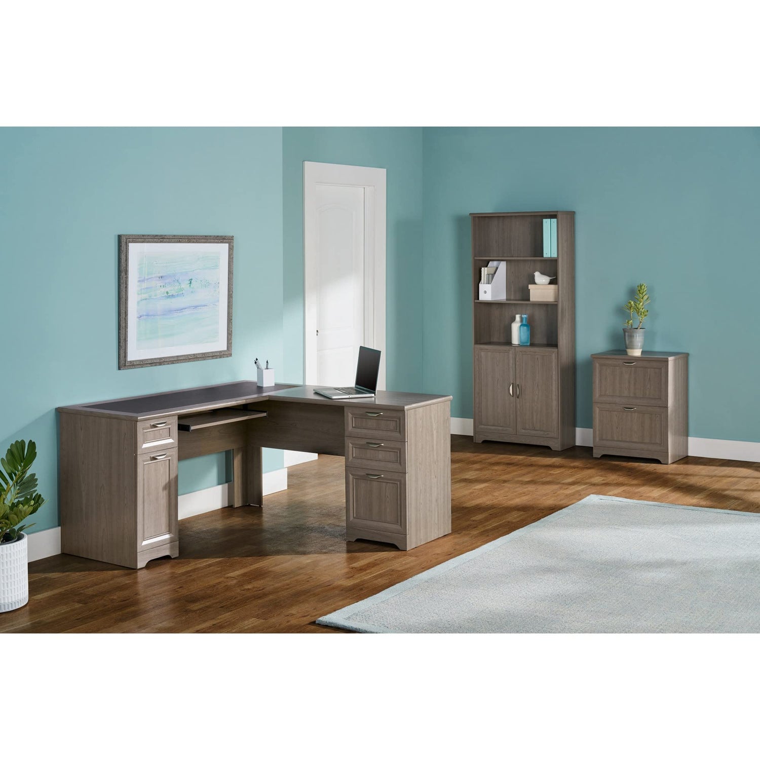 - Transform a secluded corner at home into your personal working space with this Realspace Magellan L-shaped desk. A cord management system eliminates clutter by keeping computer cables hidden, while the built-in keyboard tray lets you position your arms properly when typing. This classic Realspace Magellan L-shaped desk features 4 drawers with roomy compartments, so you can keep files and other accessories within reach.