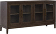 - GLASS FRONT DOORS: This buffet serving cabinet includes an adjustable shelf in each of 2 storage areas. Glass front double doors are accented by metal bar pulls with a brass-tone finish