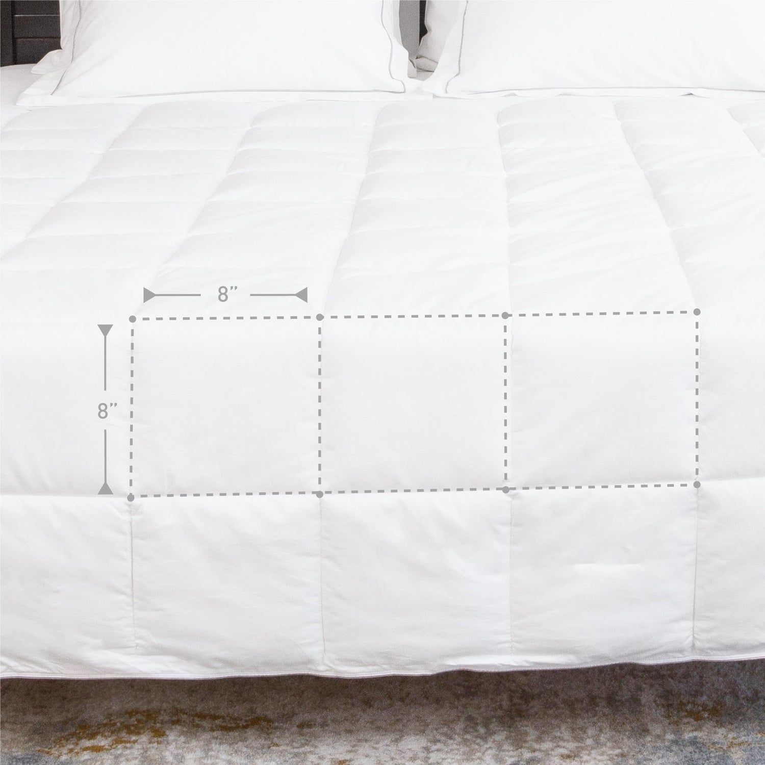 - Box Stitching & Coner Loops: Crafted with small box (8" x 8") stitching technology that secures the filling in place. Additionally, 8 built-in corner and side loops are designed to secure the duvet insert for less slippage. King size: 104" x 88".