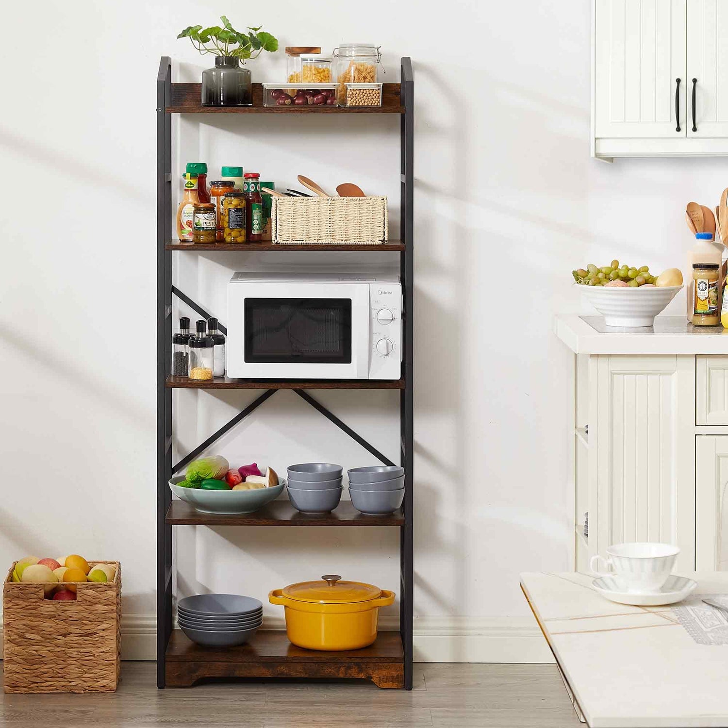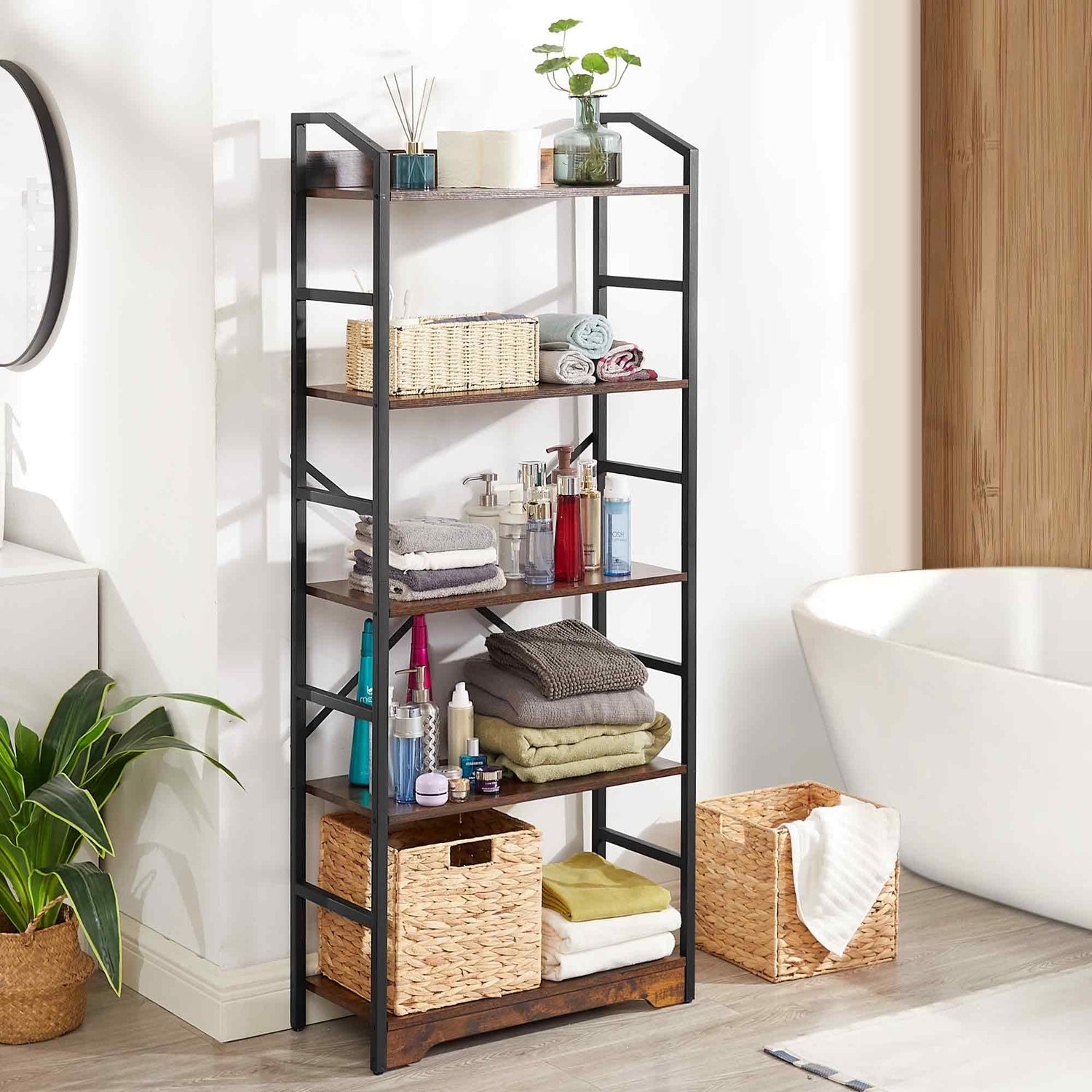 - [Multifunctional 5-Tier Bookshelf] The rustic bookcase is so simple and classic that it can be put in any space. In living room as a display shelf, open bookcase, or other room decorations. As a storage book shelf for your shampoo, clothes baskets in bathroom. Or as a bookshelf for bedroom. It can also be a plant flower standing shelf in balcony.