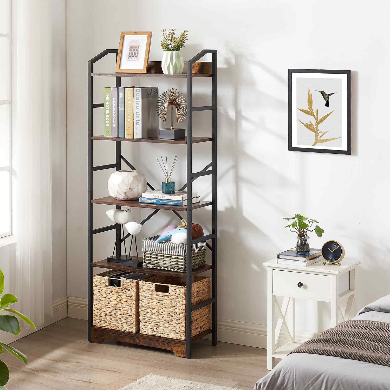 5 Tier Bookshelf with 2 Storage Baskets, Tall Bookcase Shelf Storage Organizer Wood Book Shelf, Modern Shelf Rack Shelves with Steel Frame, Multipurpose Bookshelf for Bedroom Living Room