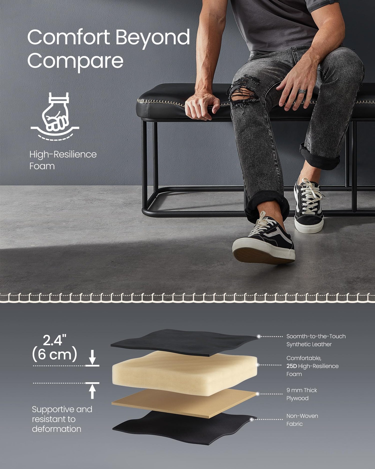 - Glide your hand over the smooth cover, then sink into the supportive 2.4" (6 cm) thick, 25D high-resilience foam. This padded bench provides a comfortable seat that endures, standing the test of time without deformation