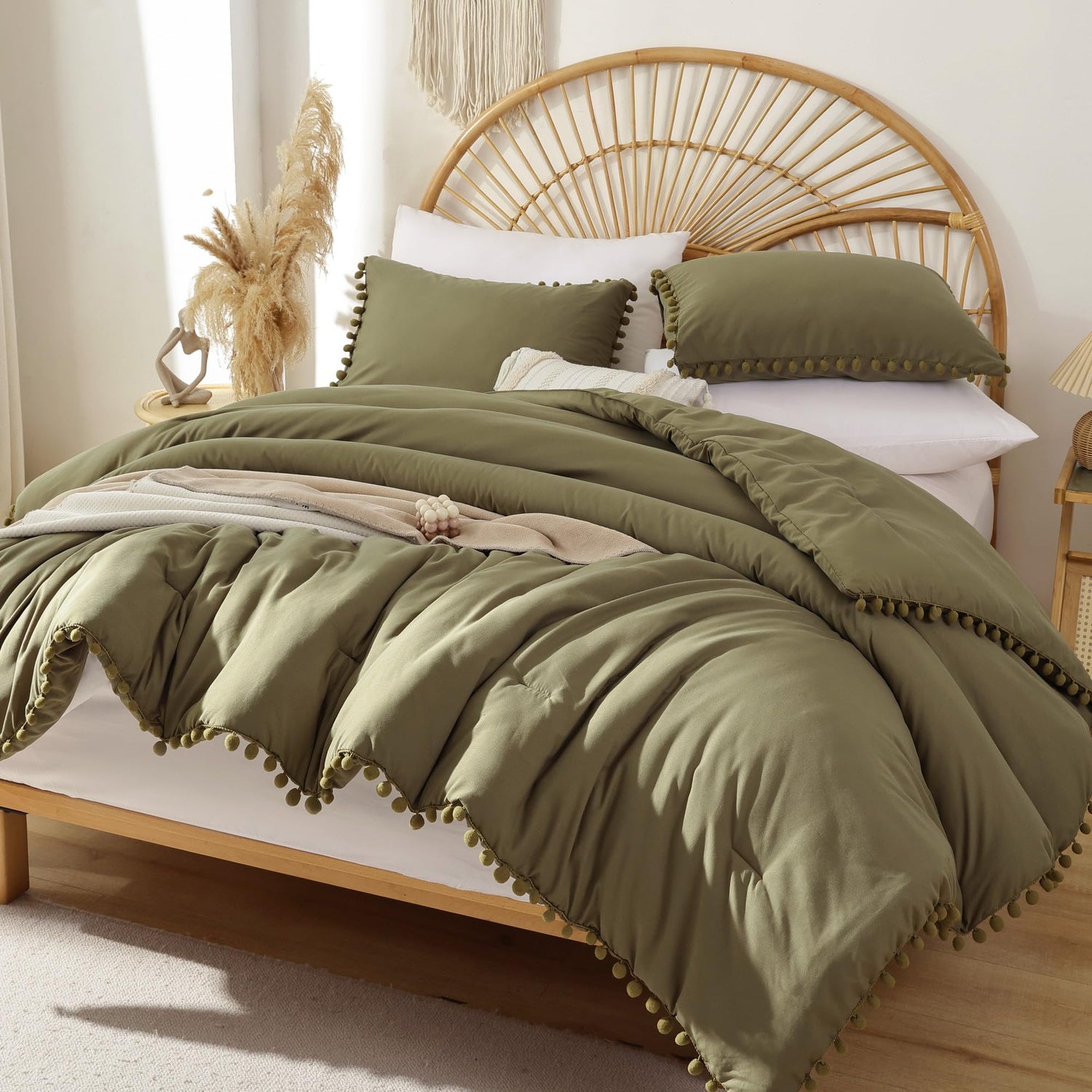 Queen Comforter Set - Comforter Queen Size Sets with Ball Pom Fringe - Olive Green / Queen is backordered and will ship as soon as it is back in stock.