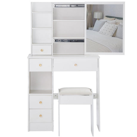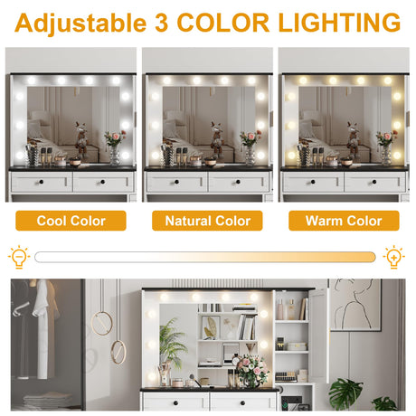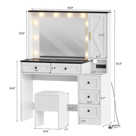 White Vanity Desk with Mirror and 9 LED Light Bulbs, Makeup Vanity Desk with Drawers and Stool