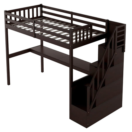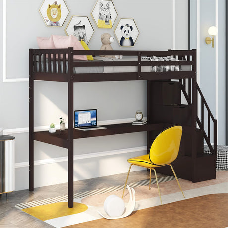Twin Loft Bed with Desk and Four Storage Shelves and 5 Drawers, Wood Loft Beds Frame