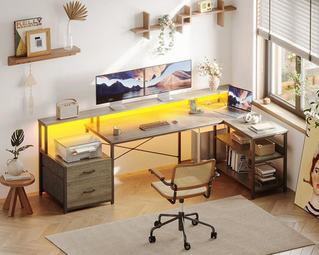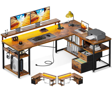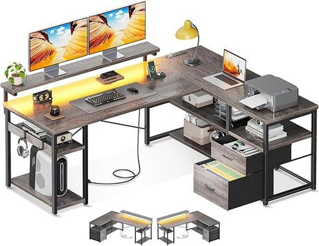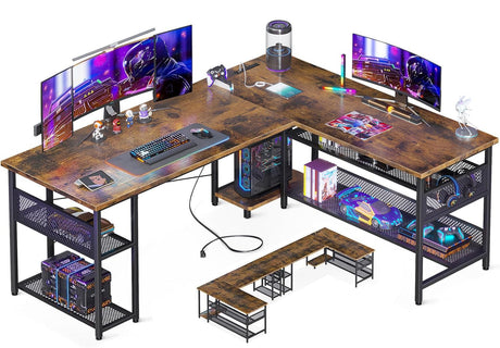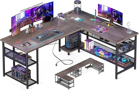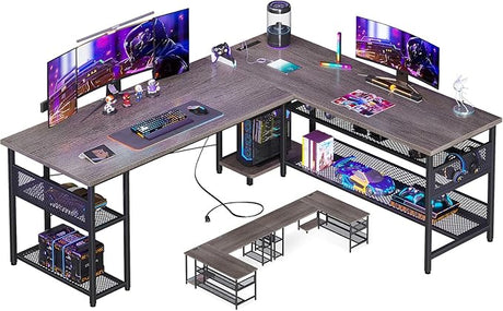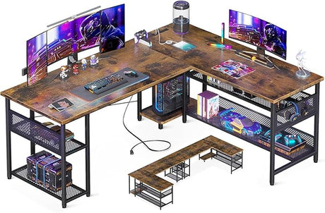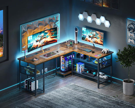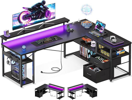 L Shaped Computer Desk with Power Outlet & LED Strip, Reversible Corner Desk