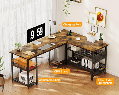 59" L Shaped Desk with Power Outlet and USB Charging Ports, Reversible L Shaped Computer Desk