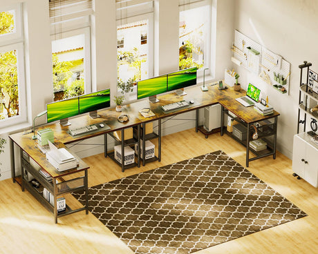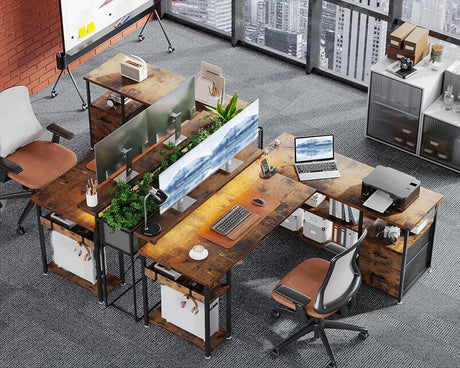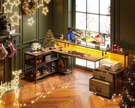 Shaped Gaming Desk with File Drawers, Reversible Computer Desk with Power Outlets &