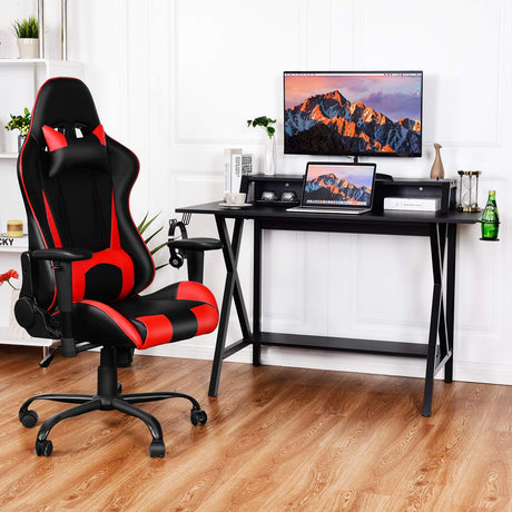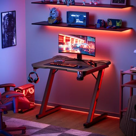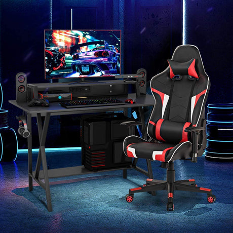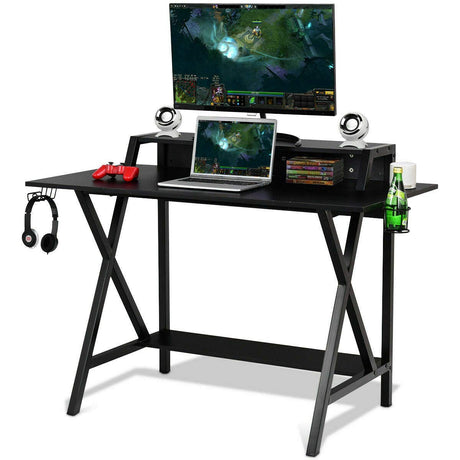 Gaming Computer Desk with Monitor Shelf, Gaming Table Workstation with Cup Holder Headphone Holder