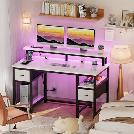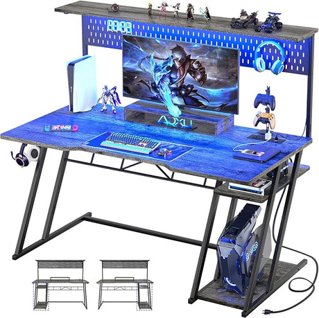 Gaming Computer Desk with Shelves and Outlets, Gaming Desk with Hutch and LED Lights