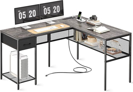 L Shaped Desk with Power Outlets, Computer Desk with Drawers & Shelves
