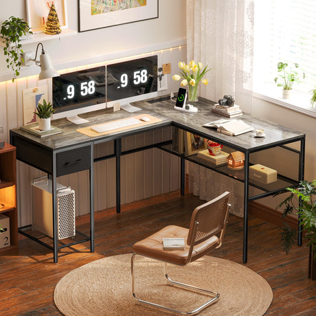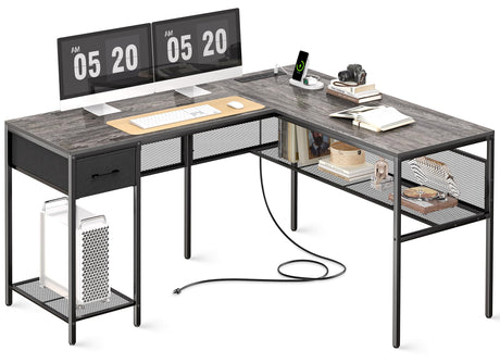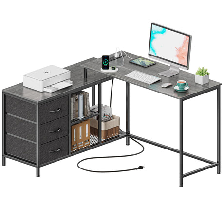 L Shaped Desk with Power Outlets, Computer Desk with Drawer, Reversible Corner Desk wi
