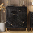 Embossed 3 Drawer Farmhouse Dresser with Ring Motif, Distressed Boho Nightstand for Bedroom - Black / Storage Cabinet is backordered and will ship as soon as it is back in stock.