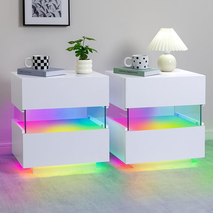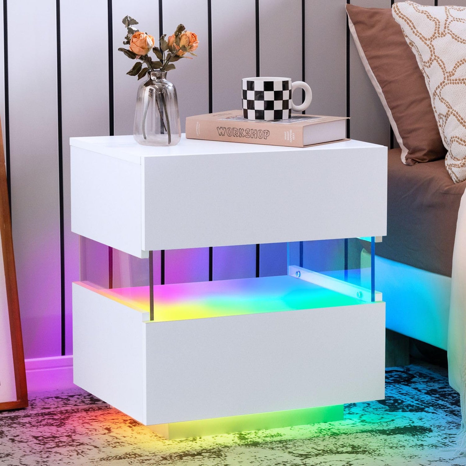 White Night Stand LED Nightstand with 2 Drawers Modern Bedside Tables for Bedroom