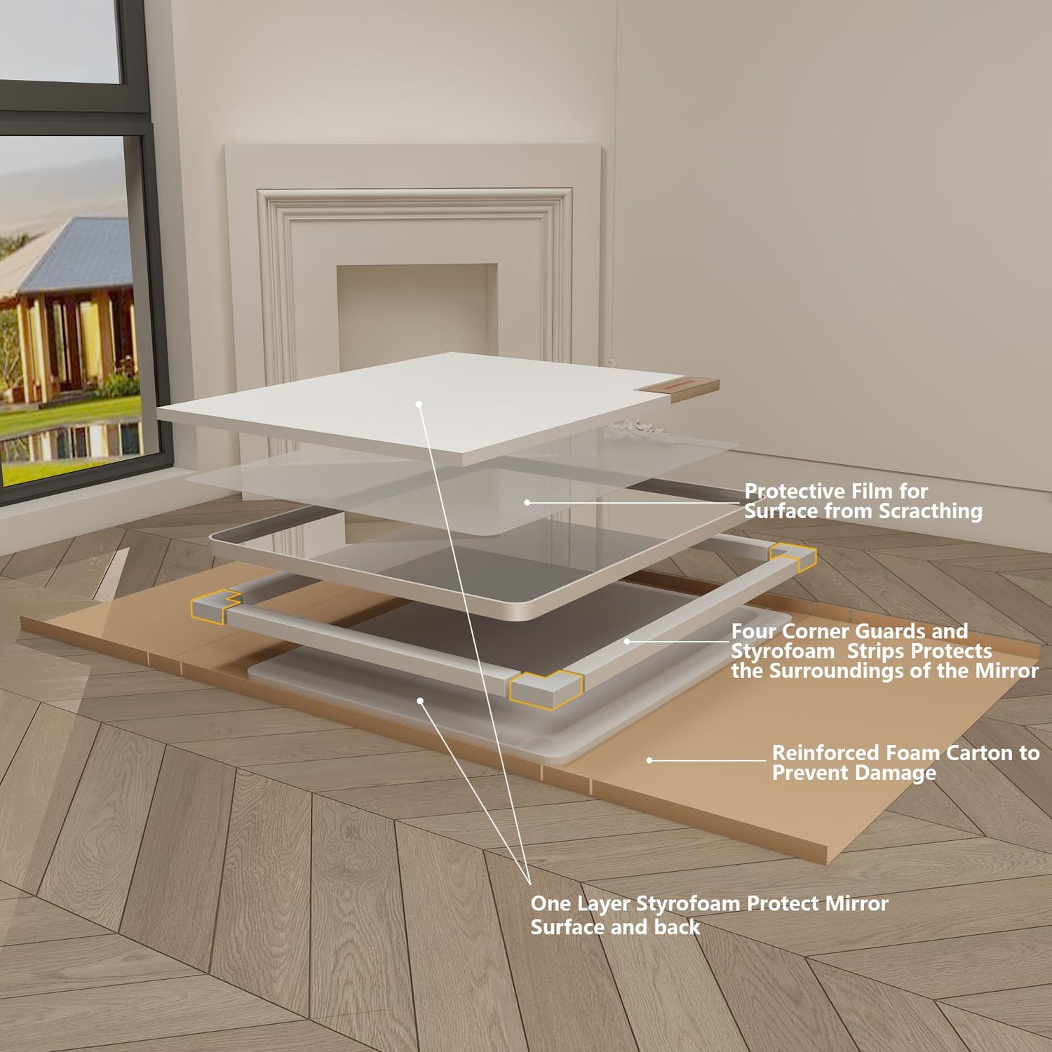 - The packing protects the mirror completely. We are committed to providing safe and all-round protection of the mirror packaging to ensure that the mirror is delivered to the customer intact. We are responsible for any damage or breakage To protect the mirror surface, we cover it with a protective film. Please remove the film before using the mirror.