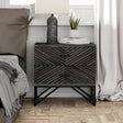 - The chest features a geometric line patterned front, adding a dynamic visual interest that makes it a statement piece in any room. Features a sophisticated dark wood finish, the modern nightstand has a transitional and modern feel, complemented by a distressed finish for a touch of sophistication