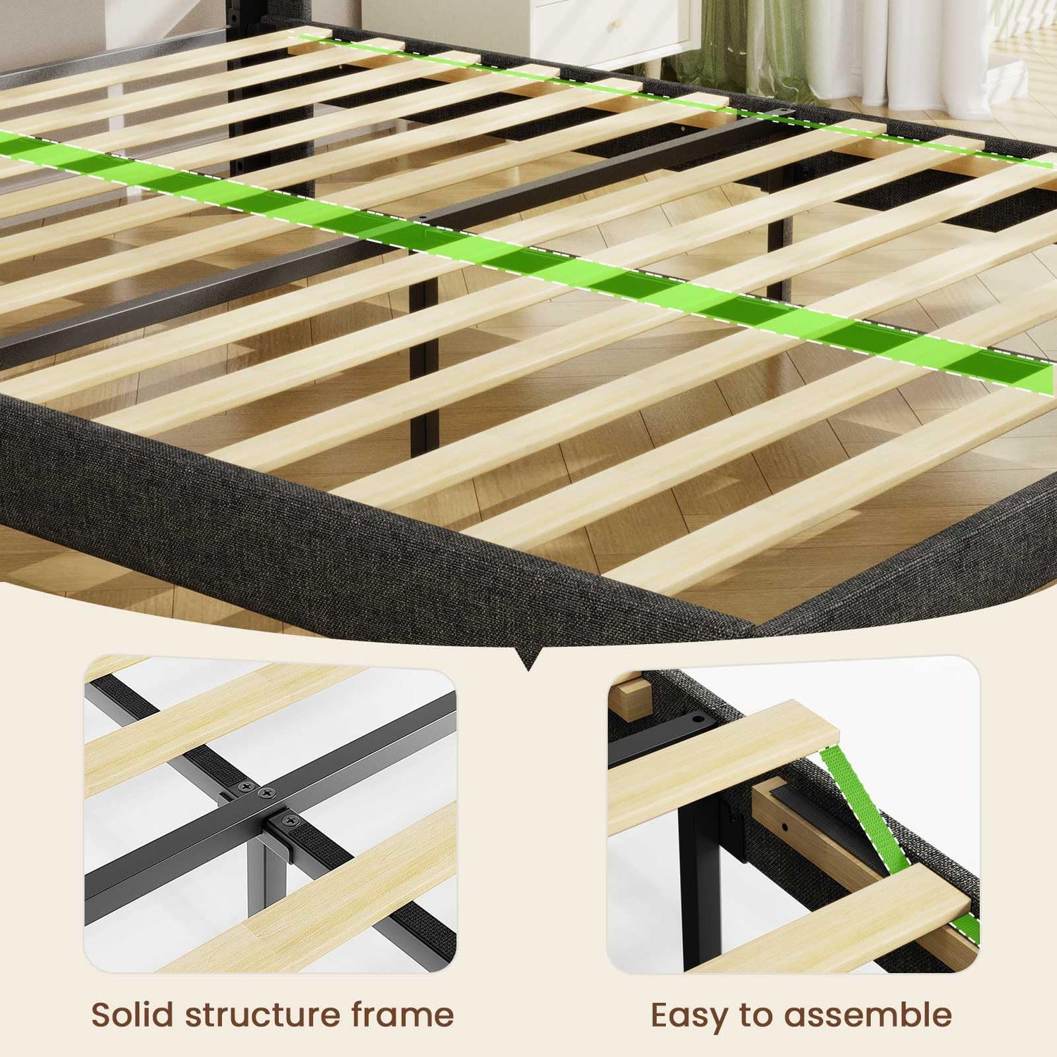 - Easy to Assembly & Stable Structure - All pieces were clearly marked, easy set up in about 50 minutes with 2 people. Upholstered bed frame queen is design with 12 straight wood slats and 3 thickened metal slats, 8 heavy duty steel support legs increase comfort and stability of bed frame, it can maximum weight capacity of 1000lb.